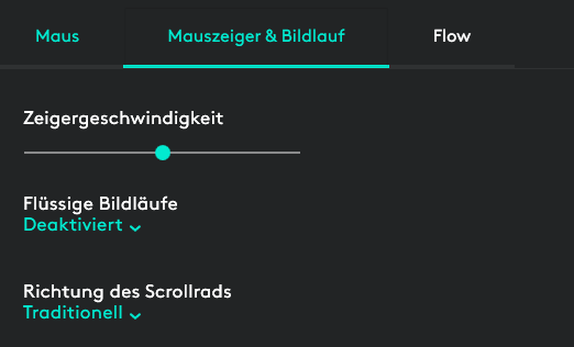 Mausbeschleunigung aus, Bei Logitech Options die Geschwindigkeit zwischen "n"und "d"gestellt. Siehe Bild: