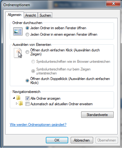 Systemsteuerung->Alle Systemsteuerungselemente(Evtl. Ansicht umschalten)-> Ordneroptionen -> Allgemein -> Auswählen von Elementen -> Anhaken Ordner mit Doppelklick öffnen