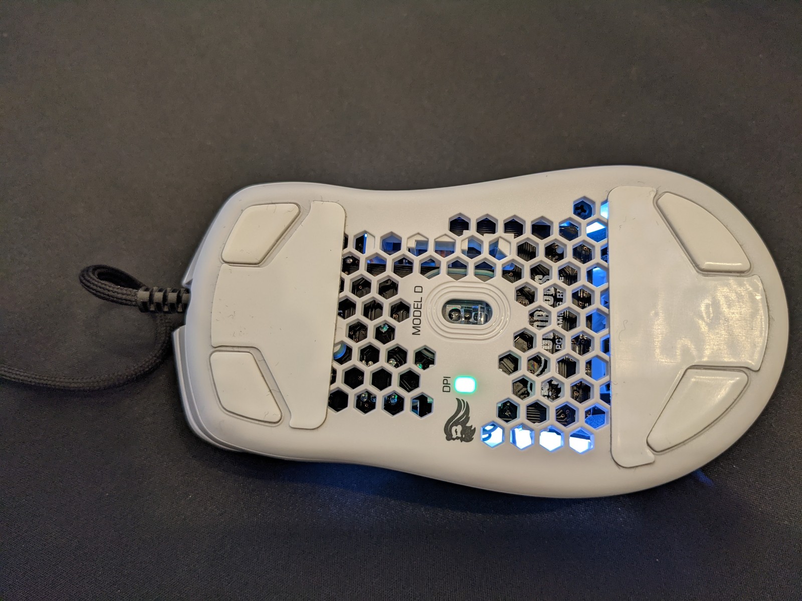 Die Seiten sind mir leider etwas zu glatt, so rutscht mir die Maus beim Anheben leicht aus der Hand. Dieses Problem habe ich mit vielen Mäusen und behebe es mit Griptape, so auch hier. Die Maus wird als Glossymodell verkauft, insofern habe ich das auch nicht anders erwartet. Im Gegensatz zu vielen Glossybeschichtungen, fühlt sich diese hier angenehm unaufdringlich an. Auch bei längerem Arbeiten ist die Oberfläche nicht schweißig, eventuell auch wegen der Löcher.