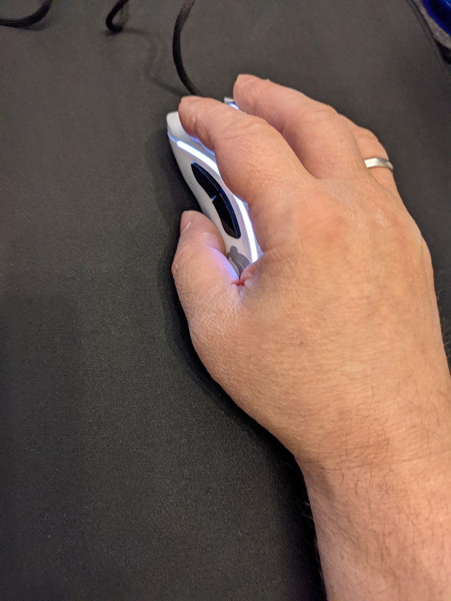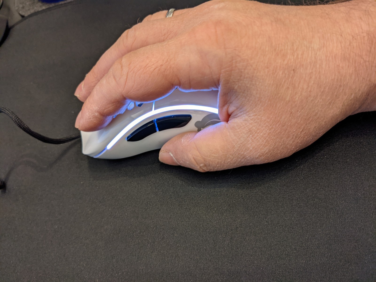 ist für mich das KO-Kriterium für die meisten Mäuse, da ich im Alter nun auch Abnutzungserscheinungen im Mausarm habe. Ergonomie und halbwegs natürliche Armhaltung sind für mich demnach bedeutend. Die Größe ist angenehm für meine eher kleinen Hände, sodass ich mit dem Palm Grip alles gut erreiche. Auch die Seitentasten sind angenehm weit hinten, womit ich sogar ohne Verrenkungen an den Forward-Button komme, das ist keine Selbstverständlichkeit.