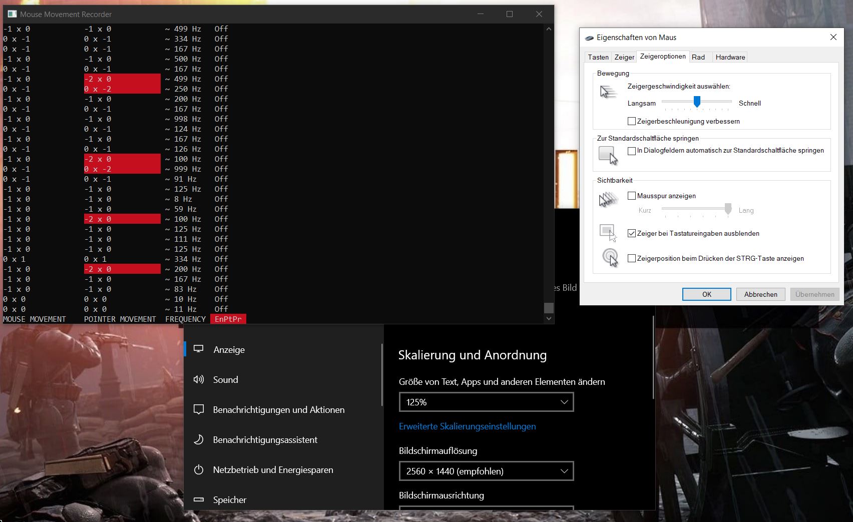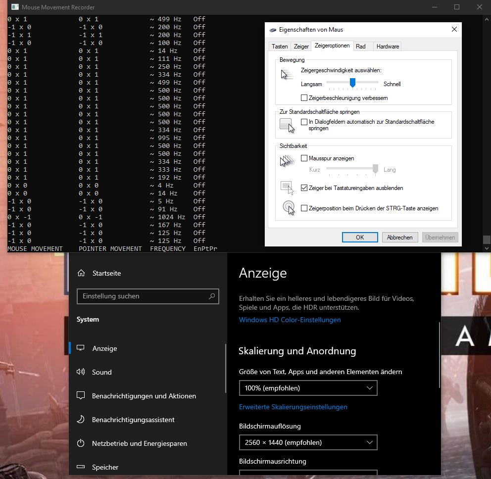 Nur bei 125% Bildschirmskalierung entspricht es jeder Logik. Mit ...Zeiger Beschleunigung aus ... habe ich abweichende Maus Bewegungs Daten, erst wenn ich ..Zeiger Beschleunigung... dazu schalte , stimmen die Maus Bewegunds Daten Plötzlich! ( natürlich habe ich die 125% Reg Datei eingelesen.