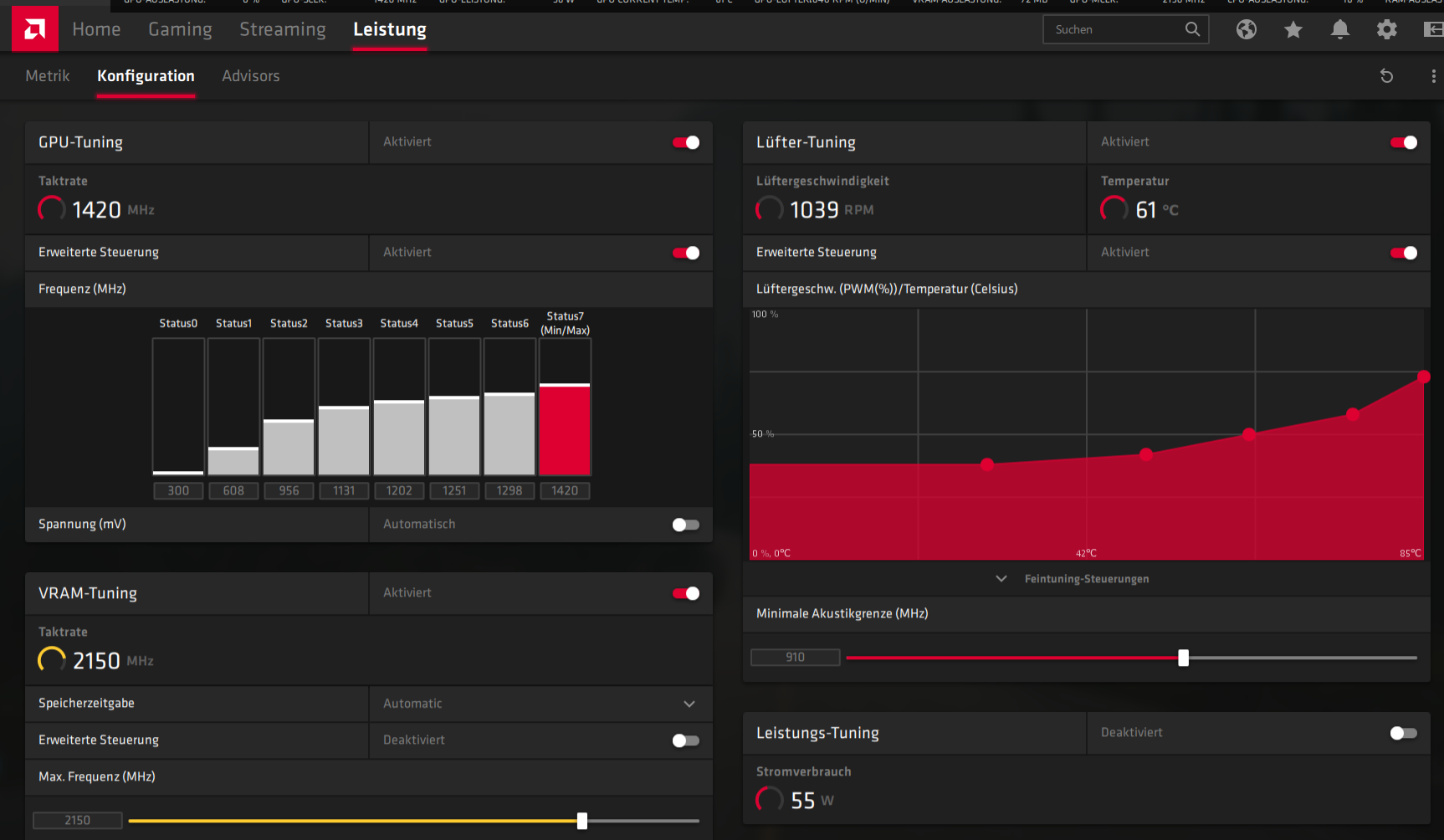 Starte ich nun RDR2, schankt der max. Takt kontinuierlich zwischen 1420 und 1350. Ich habe im Treiber folgendes probiert: