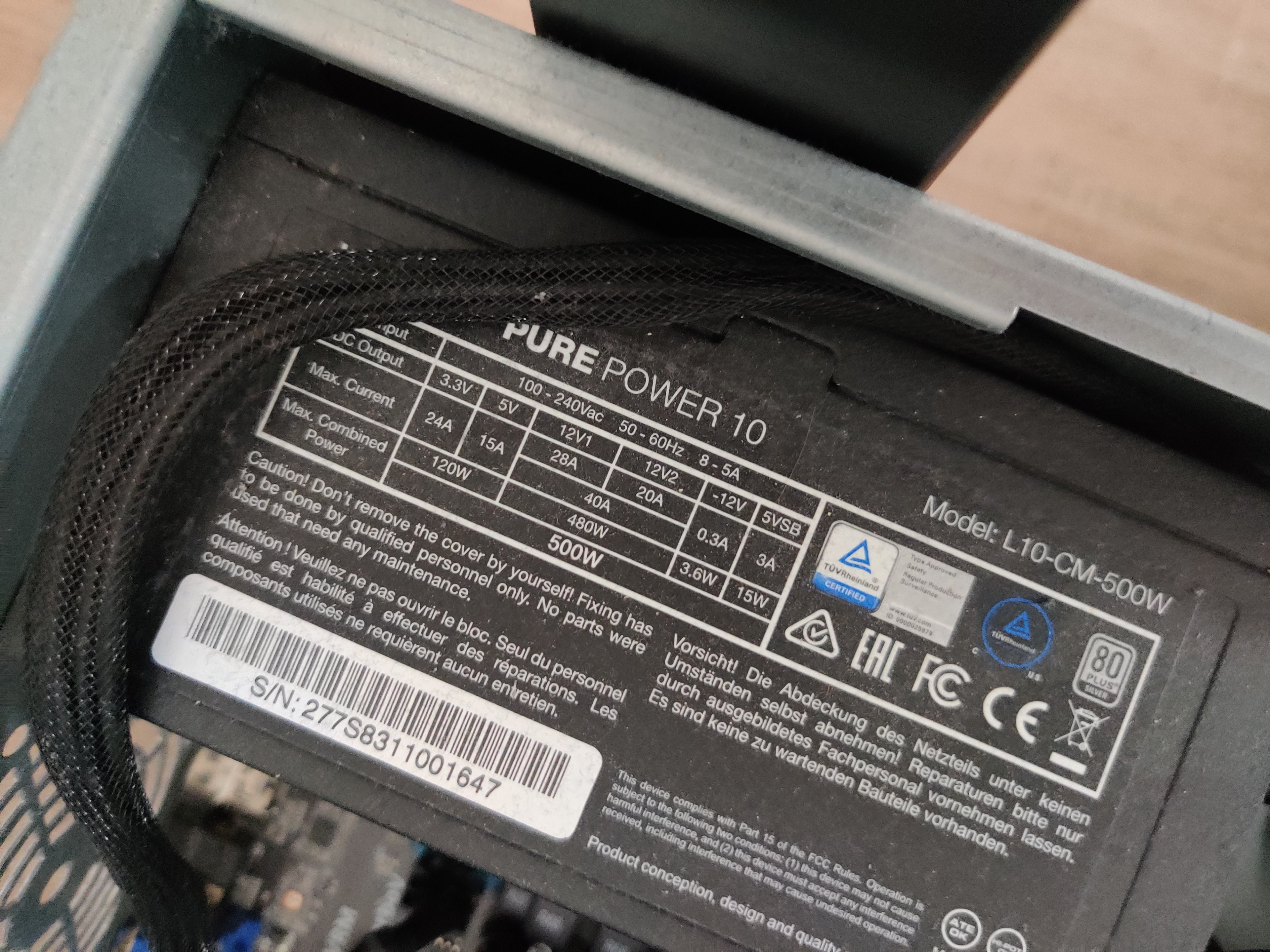 Das Netzteil ist ein bequiet Pure Power 10 500W CM (L10-CM-500W). Es hat 3 Anschlüsse für SATA Power Kabel.
