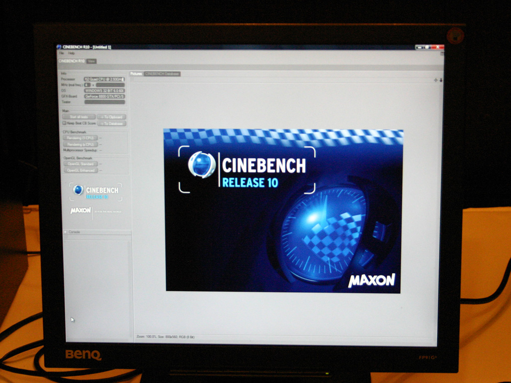 Maxon arbeitet an einer neuen Version seines auf Cinema 4D basierten Benchmarks Cinebench. Die neue Version R10 erhält dabei eine komplett neue Szene, die selbst auf einem Quad Core QX6800 erst nach 1:27 Minuten gerendert ist. Ein 3,33 GHz schneller Intel Penryn-Dual-Core-Prozessor (Wolfdale) benötigt 2:05 Minuten.