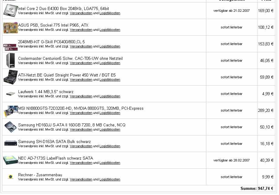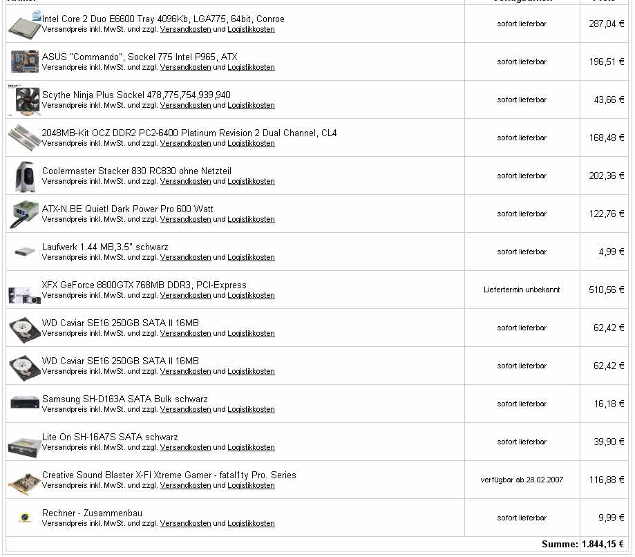 - Sockel 775 Intel CPU Core2 Duo E6600 2x2.4GHz 4MB (boxed) 300 €