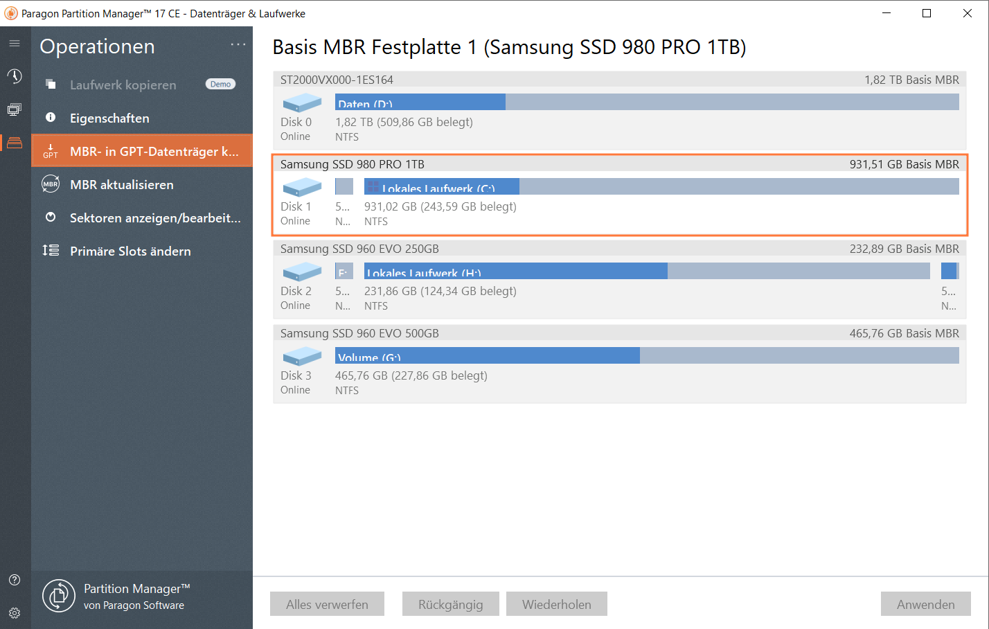 ich würde gerne als Vorbereitung für Windows 11 meine Festplatten zu GPT konvertieren, da alle noch als MBR formatiert sind. Ich habe mir dafür den "Paragon Partition Manager" heruntergeladen, bei dem diese Funktion integriert ist.