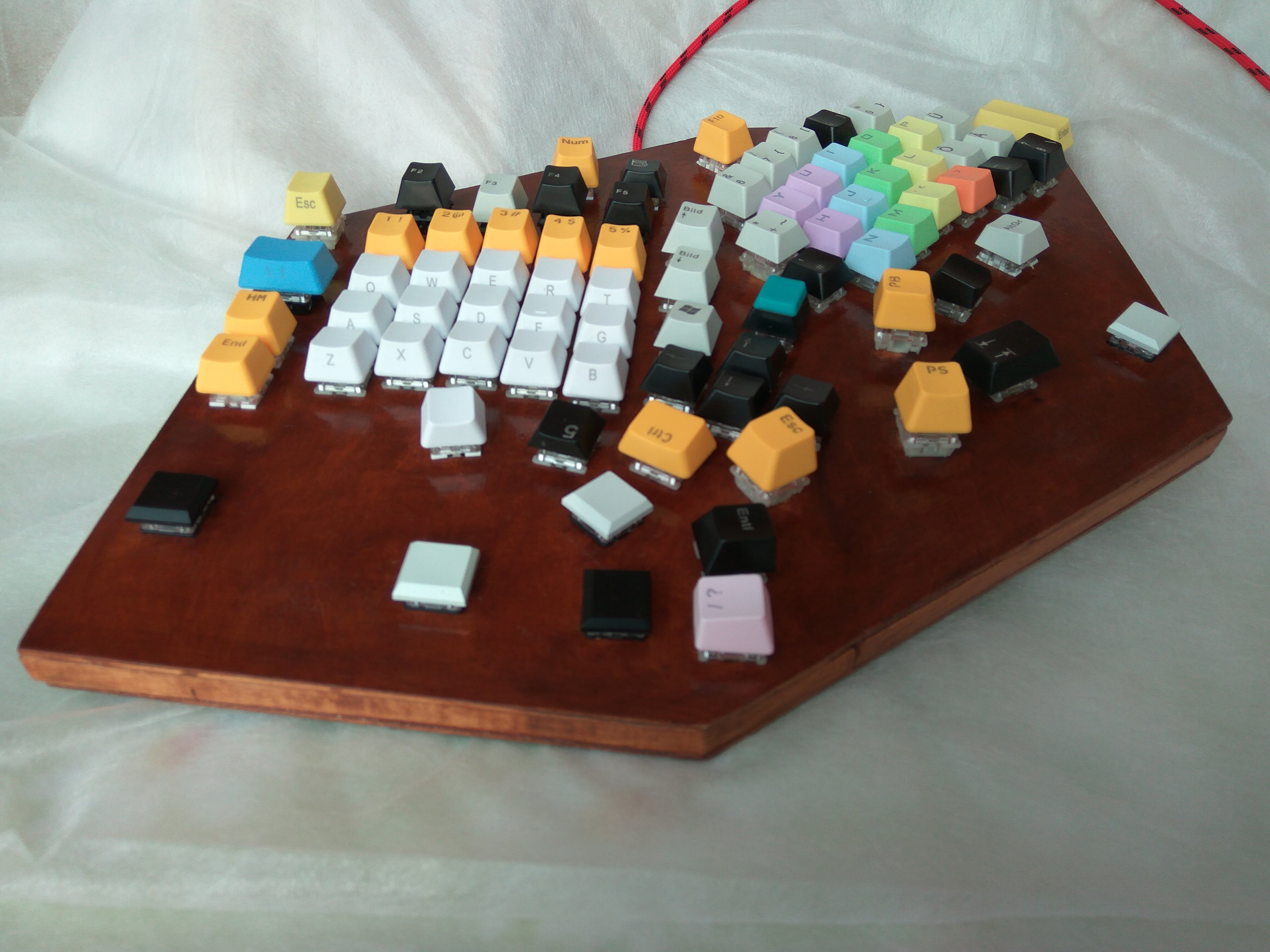 Zwei Highlights möchte ich besonders hervorheben: LCtrl hat eine der bestmöglichen Positionen am Daumen erhalten. Häufige Kombinationen wie Strg + A, S, W, X, C, V, F, PageUp, PageDown, Pfeiltasten sind weitaus komfortabler zu erreichen als beim klassischen Design links unten mit dem kleinen Finger. Und ich muss die zweite Hand nicht hinzuziehen.