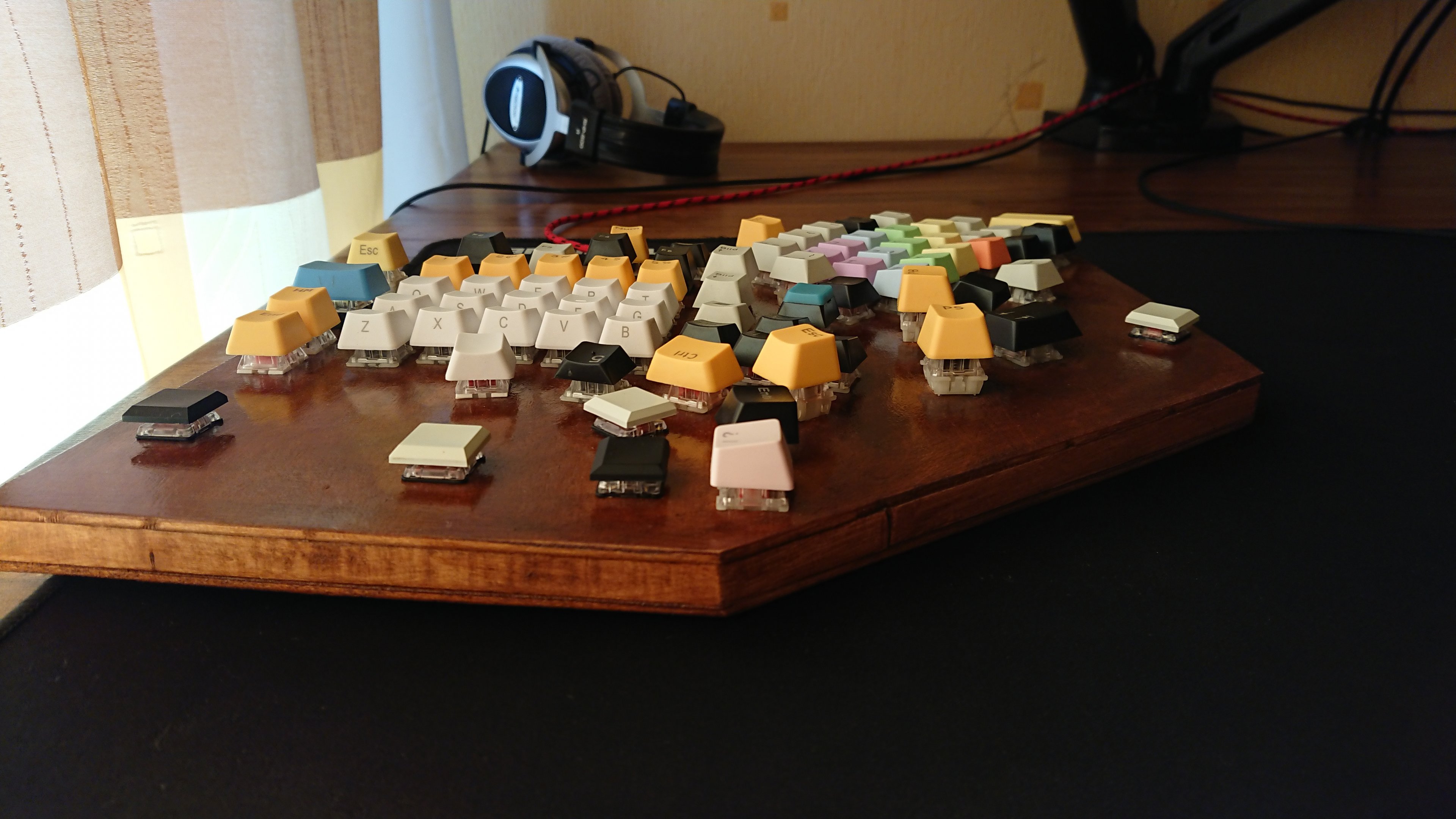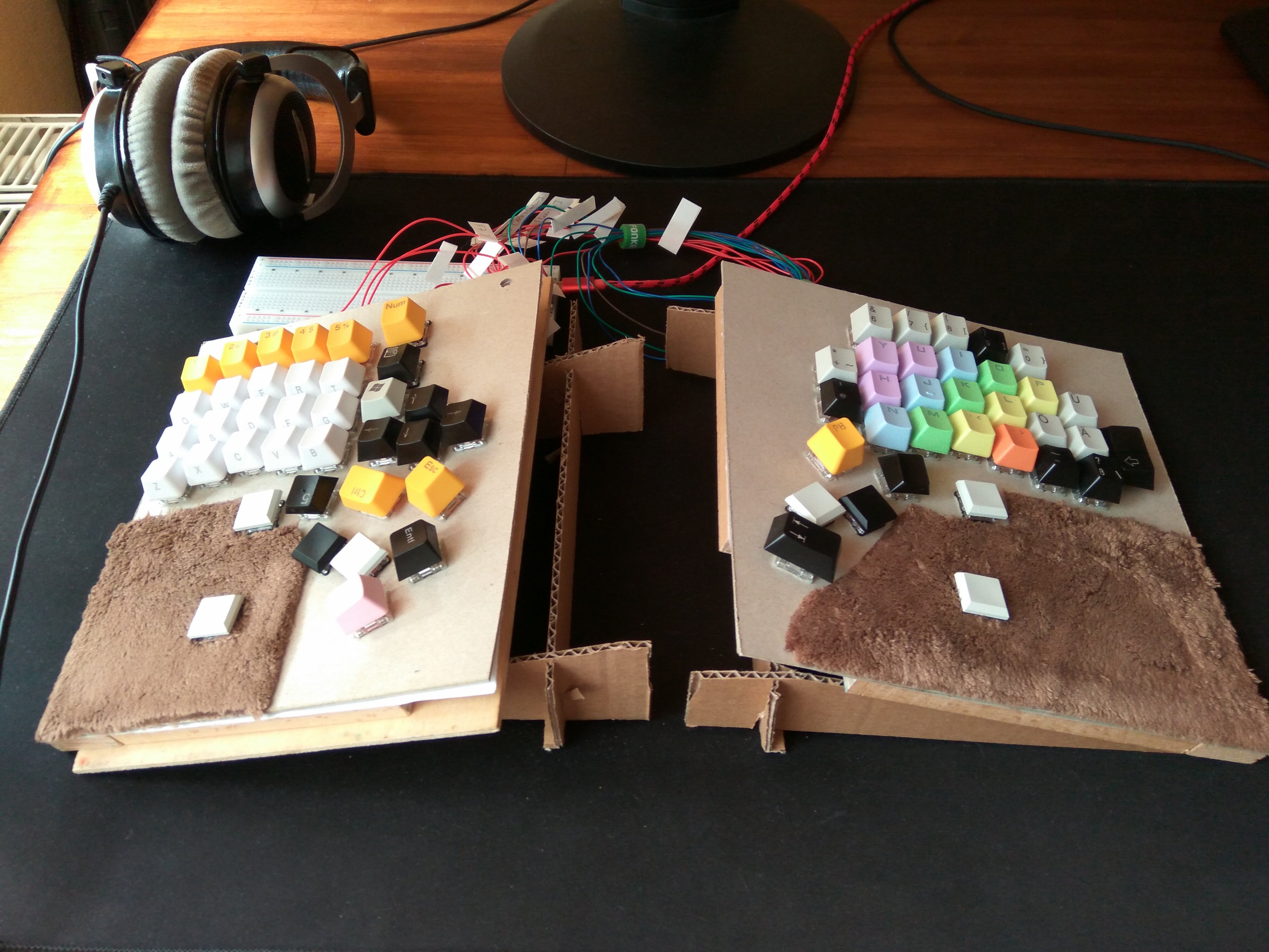Zunächst bestellte ich vor einem Jahr ein DIY-Kit der Tastatur Idobo aus China. An der Unterseite des PCB sind hot-swap-Bauteile angelötet, sodass die mechanischen Switches ganz ohne Löten nur noch vorsichtig eingesetzt werden und auf Wunsch beliebig oft gegen andere Switches im Cherry MX-Format getauscht werden können. Damit hatte ich große Freude und konnte erste Erfahrungen mit dem Programmieren der Firmware, dem Tastenlayout sowie troubleshooting sammeln. Doch auch das hat mir nicht gereicht. Ich wollte Position, Ausrichtung sowie Abstände einzelner Tasten verändern. Da 3D-Druck für mich noch zu komplex und/oder kostspielig mit ungewissem Ausgang galt, dachte ich über schnelle sowie einfache ghetto-Lösungen nach. Pappe oder dünnes Holz! Prototypen entstehen unter geringem Aufwand und ich komme schnell zu Ergebnissen, ob meine Ideen überhaupt funktionieren.
