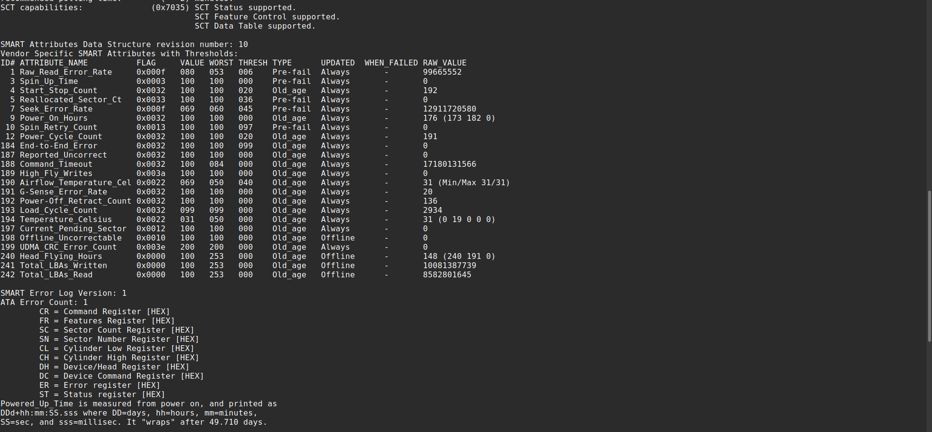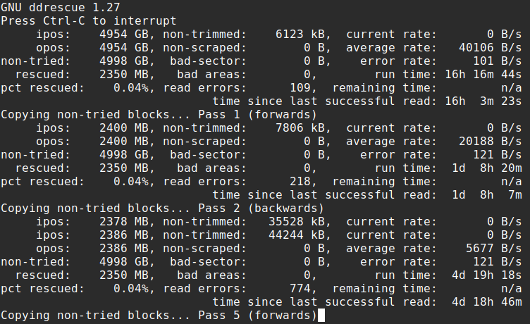 Also wollte ich mittels ddrescue die Daten sichern, aber wie im Anhang zu sehen ist, ist das nicht von Erfolg gekrönt gewesen. Ebenso befindet sich im Anhang der Output von smartctl. Nur manche Dateien lassen sich abrufen von der Platte, alle anderen Dateien führen dazu, dass sich die Platte aufhängt.