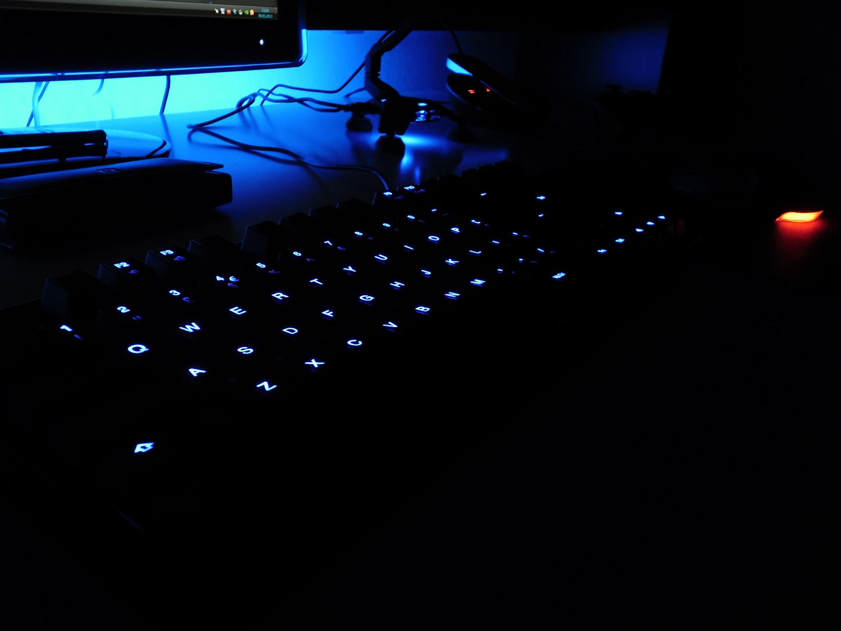 Doch, da müsste normal auch ein blauer drunter sein, vielleicht hörst du den klick nur nicht so laut weil der Bottom Out bei der Leertaste ein bisschen lauter ist. Du kannst ja auch die Leertaste abmachen und nachsehen, dafür musst du sie nicht mal die Stabilisatoren rausmachen, einfach anheben bis sie von dem Schalter weg ist, dann kann man schon druntergucken