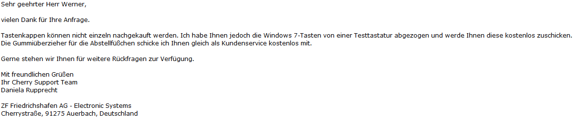 Trimipramin schrieb:So, nun gilts: Mal schauen was sie antworten. Also mindestens das mit den Gummidingern will ich im Sinne von einer Nachbestellmöglichkeit gelöst haben, denn diese sch** Dinger sind verflucht dünn. ^^