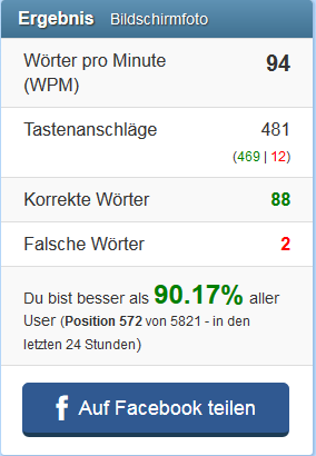 Und im Vergleich zu meiner alten Logitech Illuminated ist es trotzdem eine große Verbesserung. Da war ich vielleicht knapp über 80, und mit deutlich mehr Fehlern weil ich immer wieder abgerutscht bin.