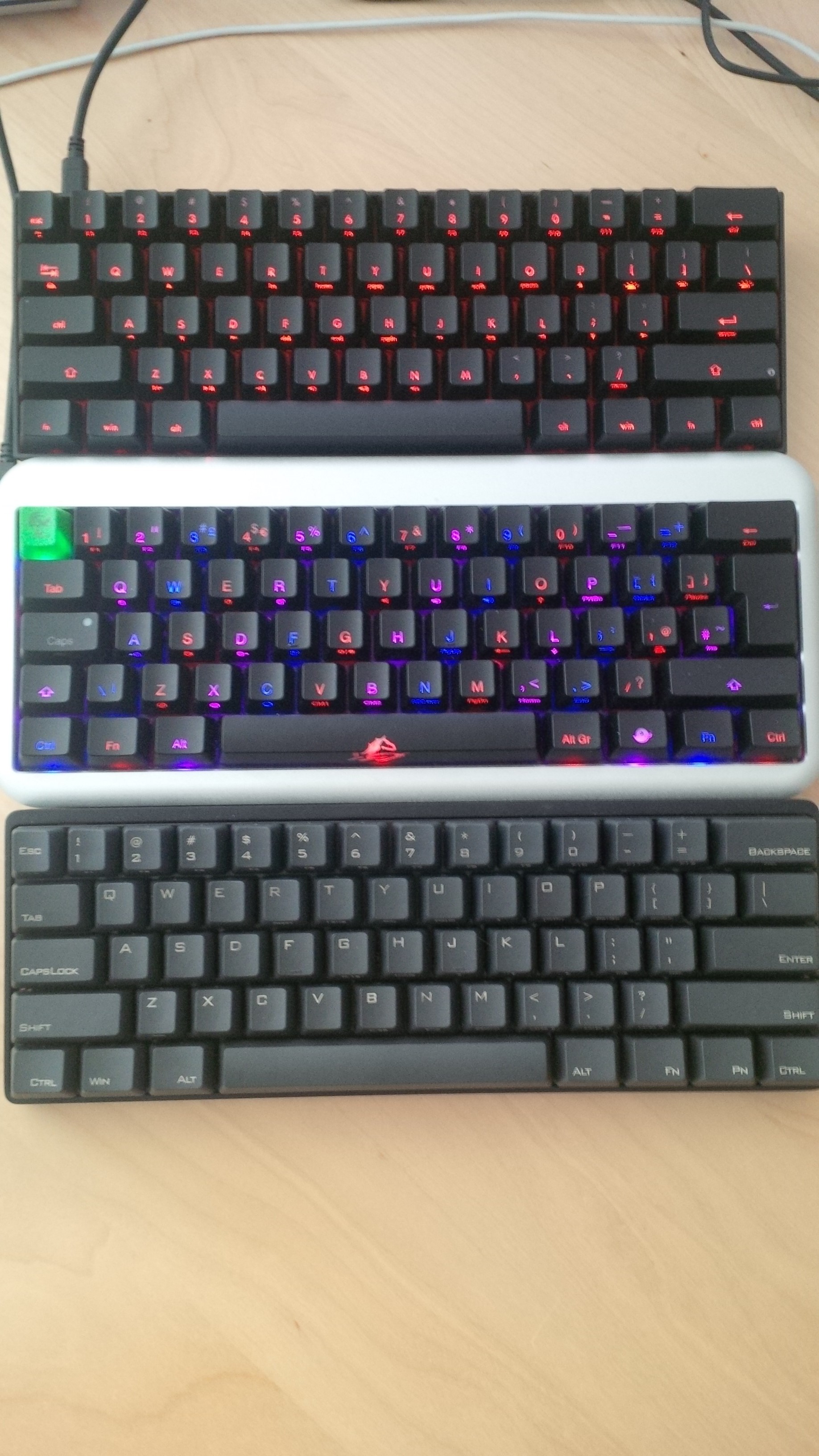 Also die meisten. Das, was mich damals hörte und mich von einem Import einer V60 mit Whites abgehalten hat ist wahr: Die Switches fühlen sich nicht durch die Bank gleich an und machen auch andere Geräusche. Während T sich anhört wie ein MX-Green, ist beispielsweise das S leiser als die Clears meiner Pok3r. So doof das auch ist, darüber werde ich hinwegsehen können, da mir sowohl Clears als auch Greens gefallen