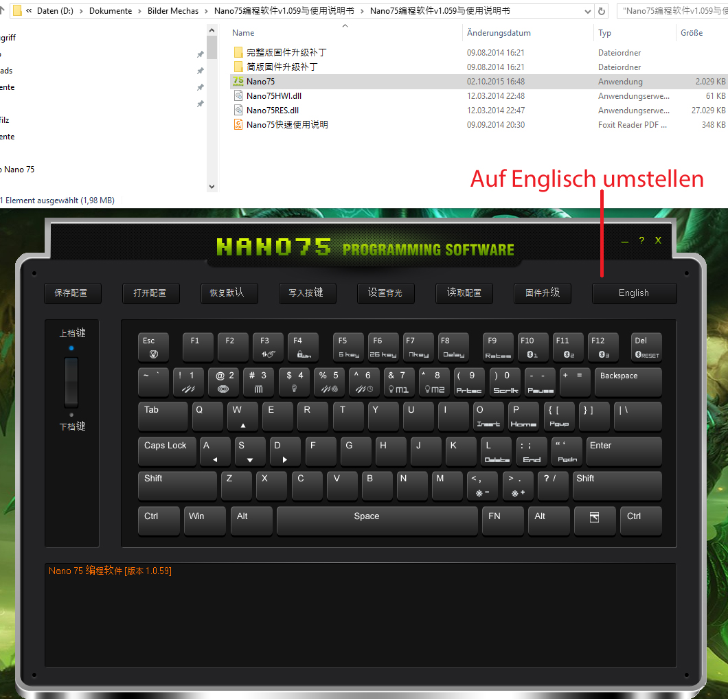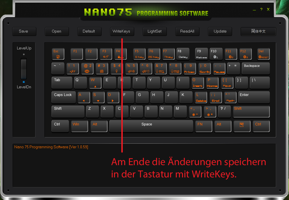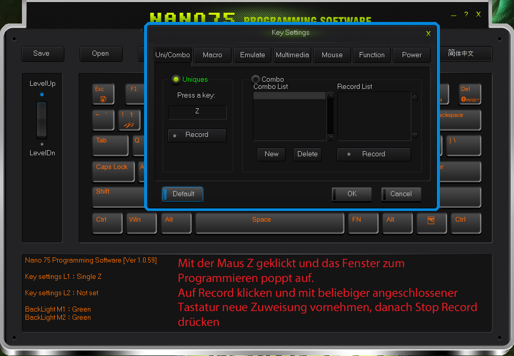 Danke erstmal für die Bilder. Die Software sieht schon furchtbar benutzerunfreundlich aus. Aber ist es nicht so, dass die ganzen Macros auf der Tastatur gespeichert werden und die Software nur zur Konfiguration benötigt wird? Könnte man nicht einfach FN+Key als ANSI-Code-Eingabe definieren und praktisch unabhängig von Software arbeiten?
