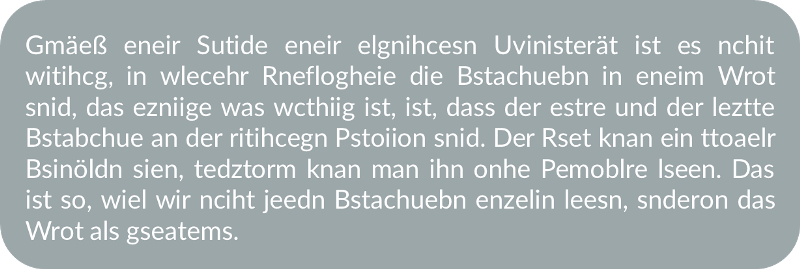 Da gibts ja diese "legende" davon das man das trotzdem fehlerfrei lesen kann, selbst wenn Buchstaben umgestellt werden oder noch viel mehr fehlt - kp was da dran ist. Sieht aber luschtig aus.