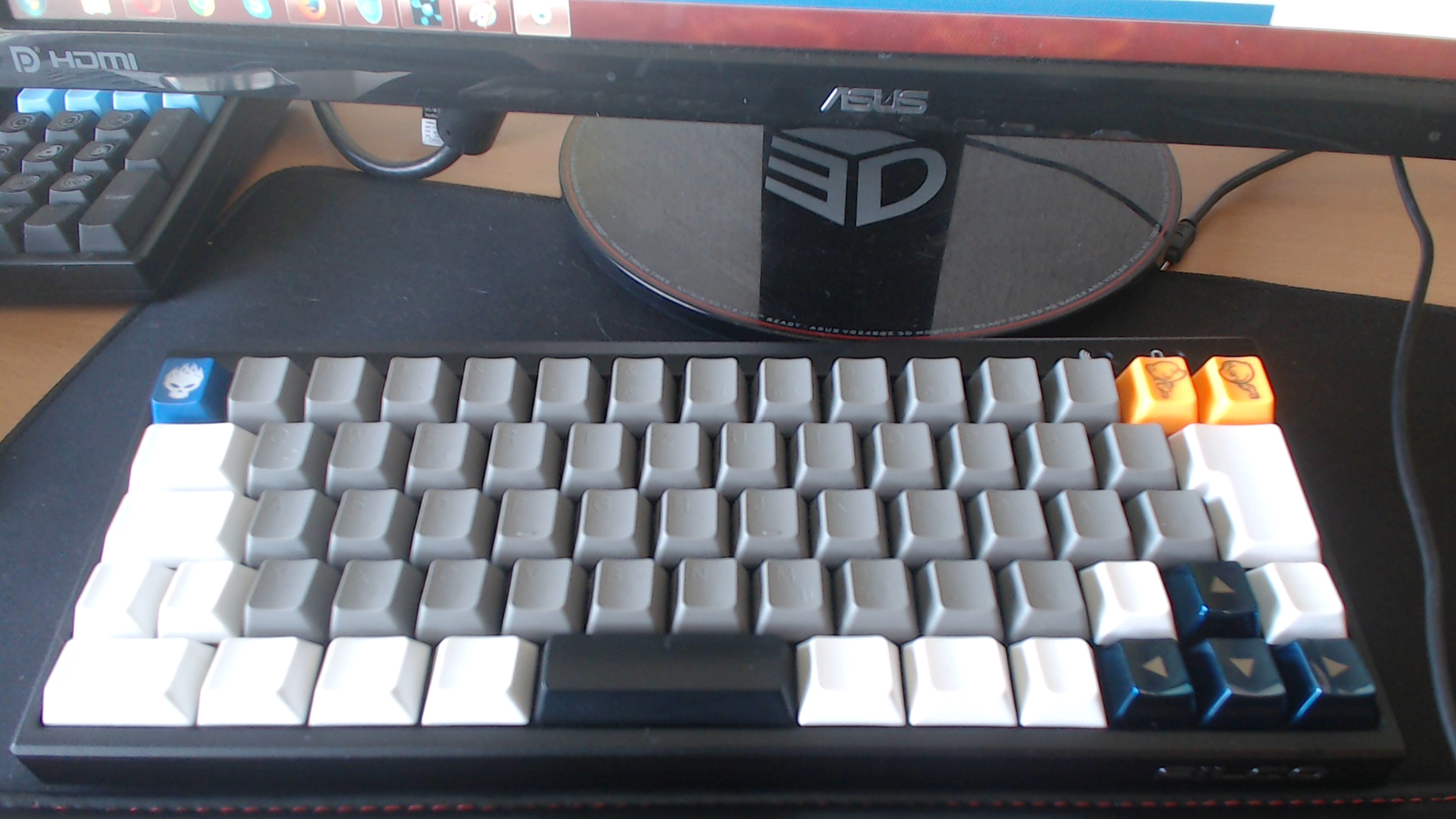 Nach anfänglicher Skepsis find ich das Setup gar nicht mehr so hässlich. Jemand zufällig ne Ahnung, ob WASD Keyboards auch custom drucke für die Leertaste machen? Die hat ja echt nen komisches Format.