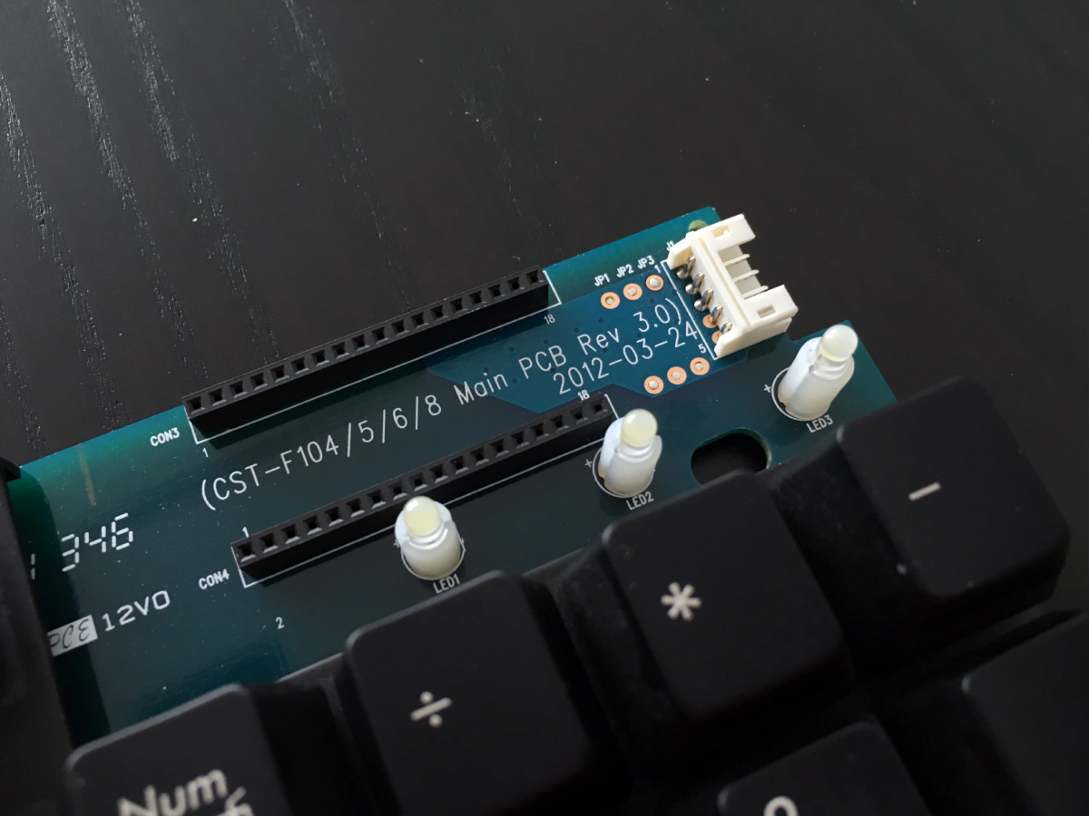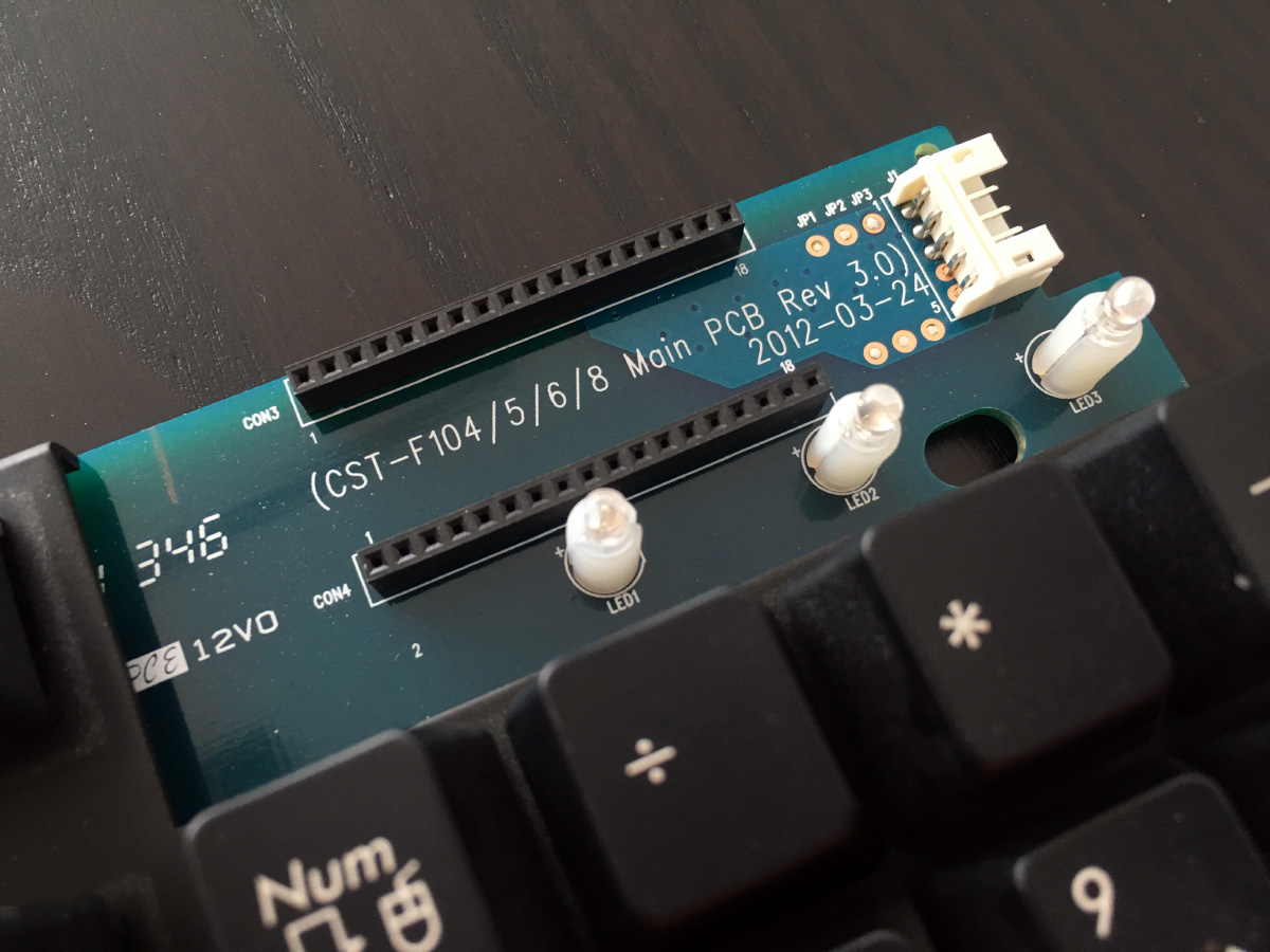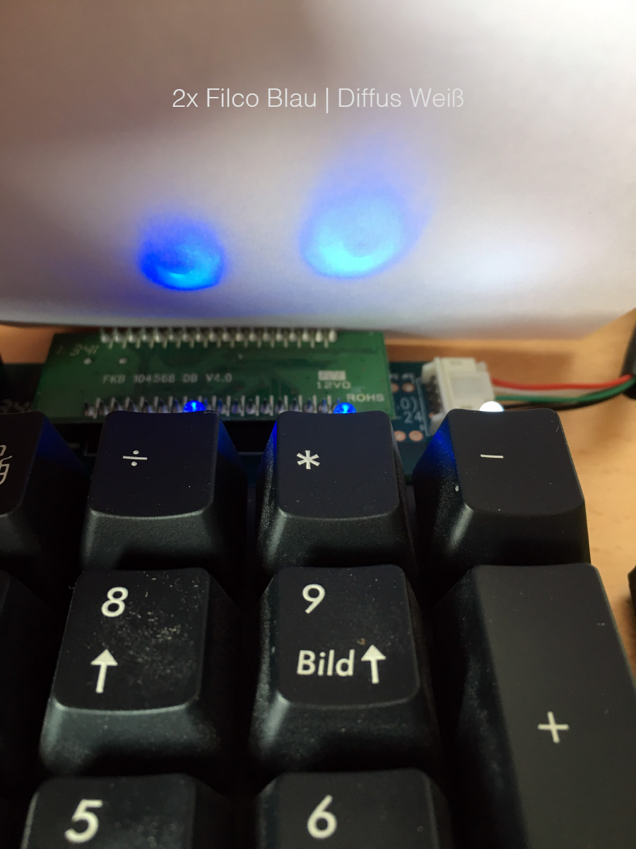 Wichtig ist wirklich so gut es geht das Lötzinn mit der Entlöpumpe aufzusaugen, andernfalls bekommt man Probleme die neuen LED's durch die Löcher im PCB zu schieben. Obiges Bild entstand nach dem wechsel, geht mit Sicherheit auch schönerDie ausgelöteten Filco LED's kann man dann einfach aus dem weißen Plastikabstandshaltern ziehen und anschließend die neuen reinstecken, beim verlöten auf richtige Polung achten! + Pol ist auf dem PCB gut erkennbar gekennzeichnet.