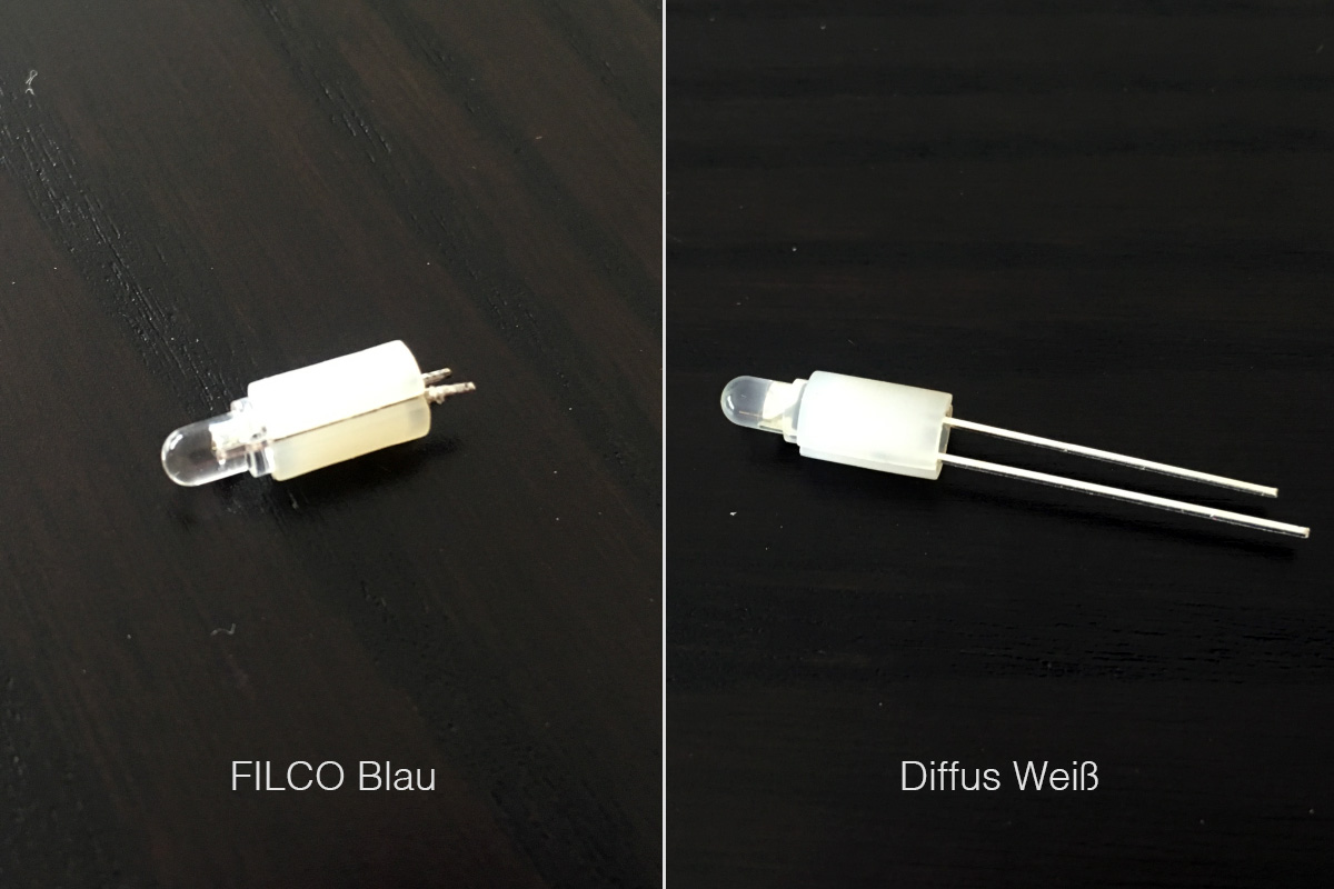 Die diffusen LED's haben einen leichten Gelbschimmer wenn sie aus sind, fällt im zusammengebauten Zustand aber nicht weiter auf. Auf dem 1ten Bild sieht man den Vergleich der Leuchtkegel von diffus zu klar.