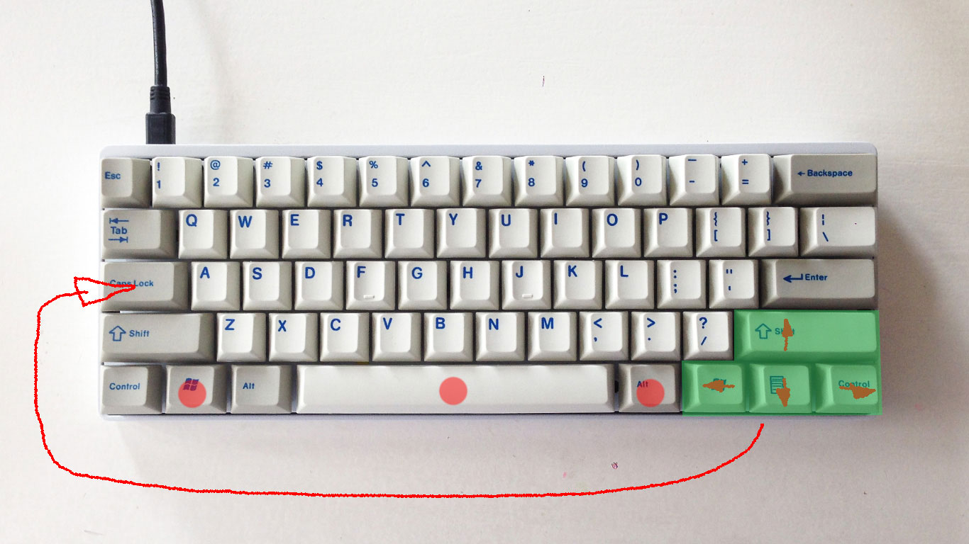 ich drücke "left-win + recht-alt + spacebar" und schon sind die vier rechts unten (win, fn, ctrl, shift) meine pfeiltasten. muss ich nach jedem boot erneut machen - also wohl nach stromverlust. da fn dann fehlt, kann man das per jumper auf capslock setzen - braucht ja eh keiner.