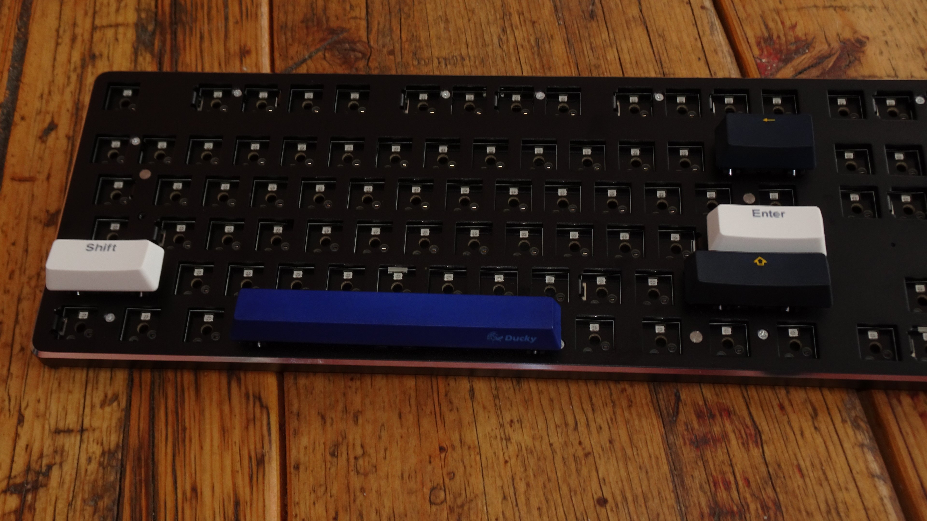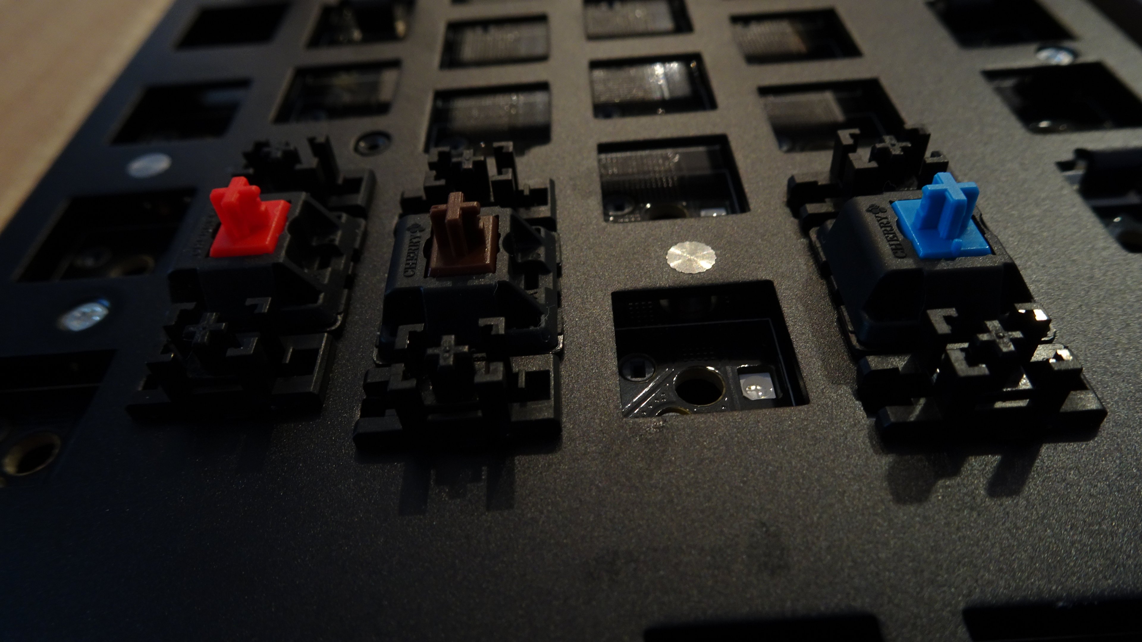 Was allerdings in meinen Ohren überhaupt nicht geht, ist der Klangeindruck, sowohl auf das Geräusch an sich als auch auf die Lautstärke bezogen: Nach dem Auspacken und ein paar Mal in der Hand drehen dachte ich, es ist was lose und fliegt im Gehäuse herum, aber ohne Switch und Tastenkappe hat ein Cherry-Stabi nun mal viel Bewegungsfreiheit... Um den Geräuschpegel ohne Stabi-Klappern beurteilen zu können, sind kurzzeitig die Schalter aus meinem Switch-Tester auf die jeweiligen Positionen auf der GMMK umgezogen und wurden mit Ducky PBT- bzw. zum Teil auch billigen China-ebay-ABS-Caps bestückt.