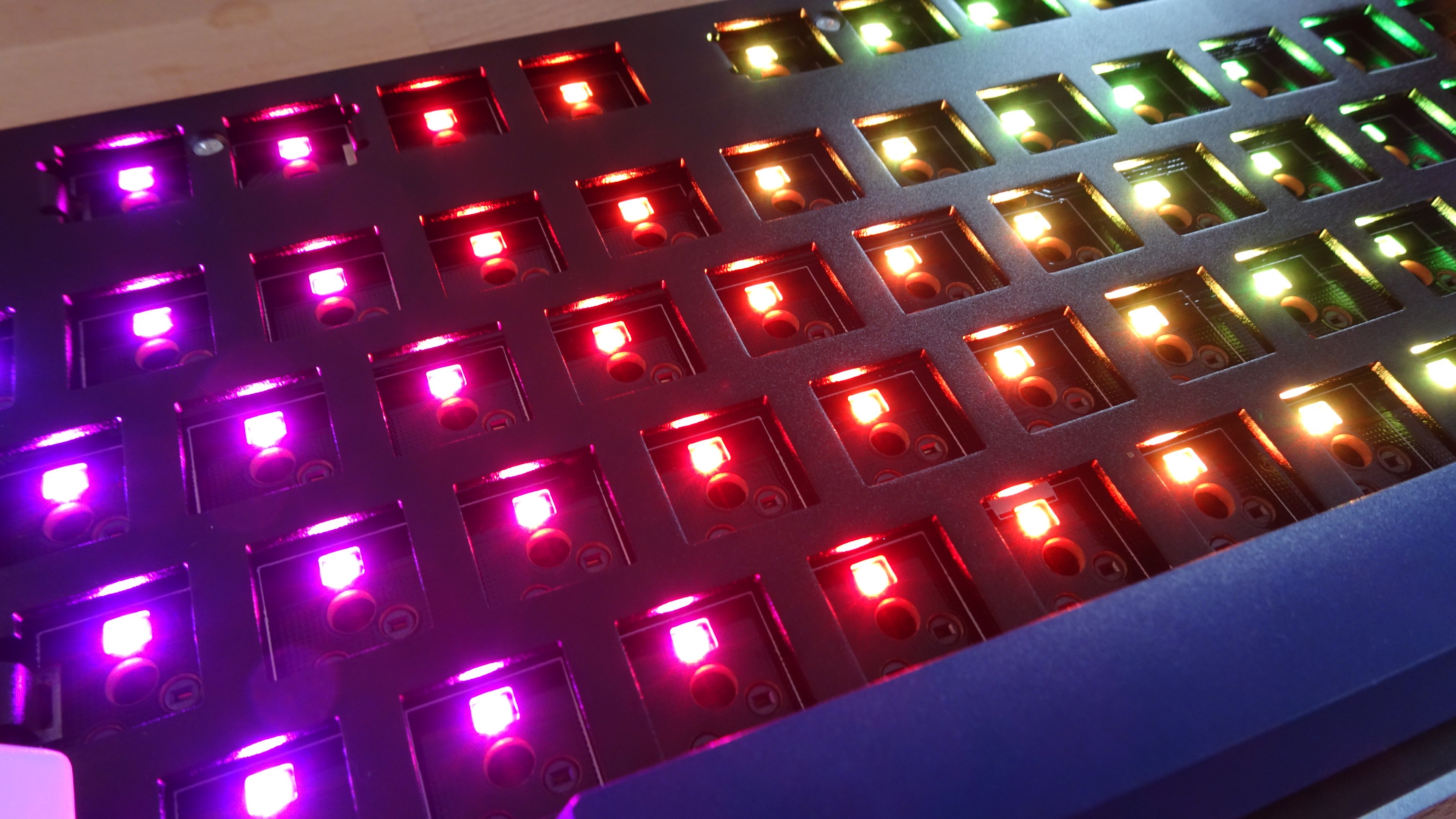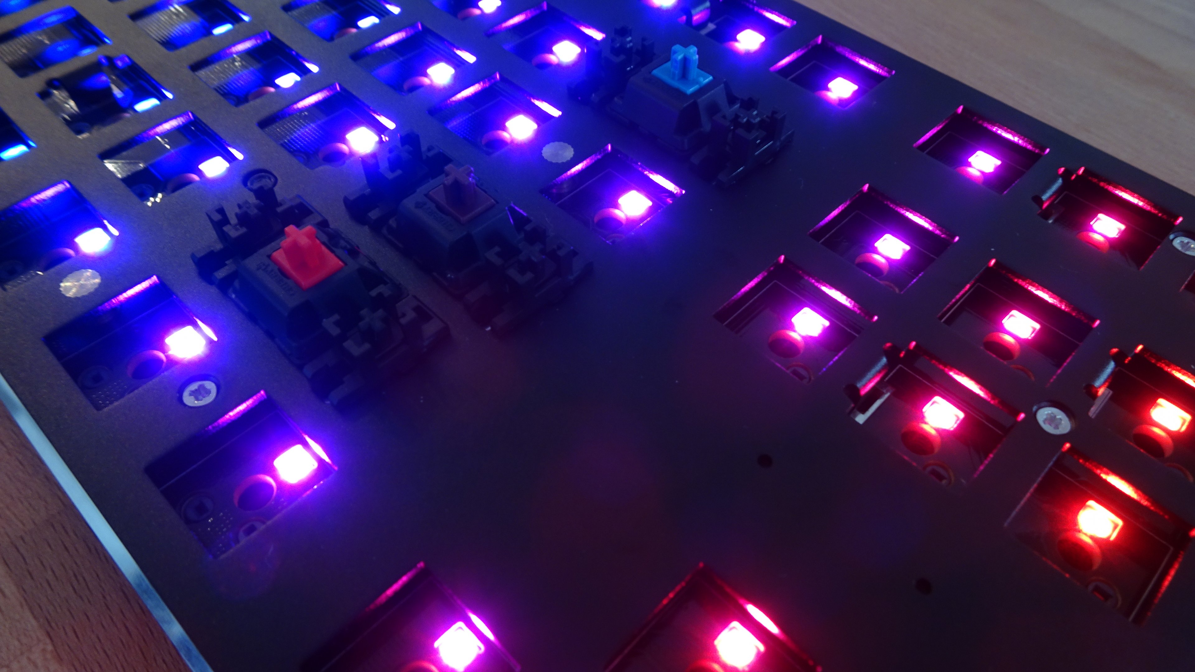 Wie die RGB-Beleuchtung unter der vollständig bestückten Tastatur aussieht, kann ich mangels Motivation, meine Shine 6 eines MX-RGB-Blue zu berauben, nicht beurteilen. Ohne montierte Schalter sehen die sich kaum vom PCB abhebenden LED aber sehr schön aus. Die Software zum Steuern jener habe ich nicht ausprobiert.