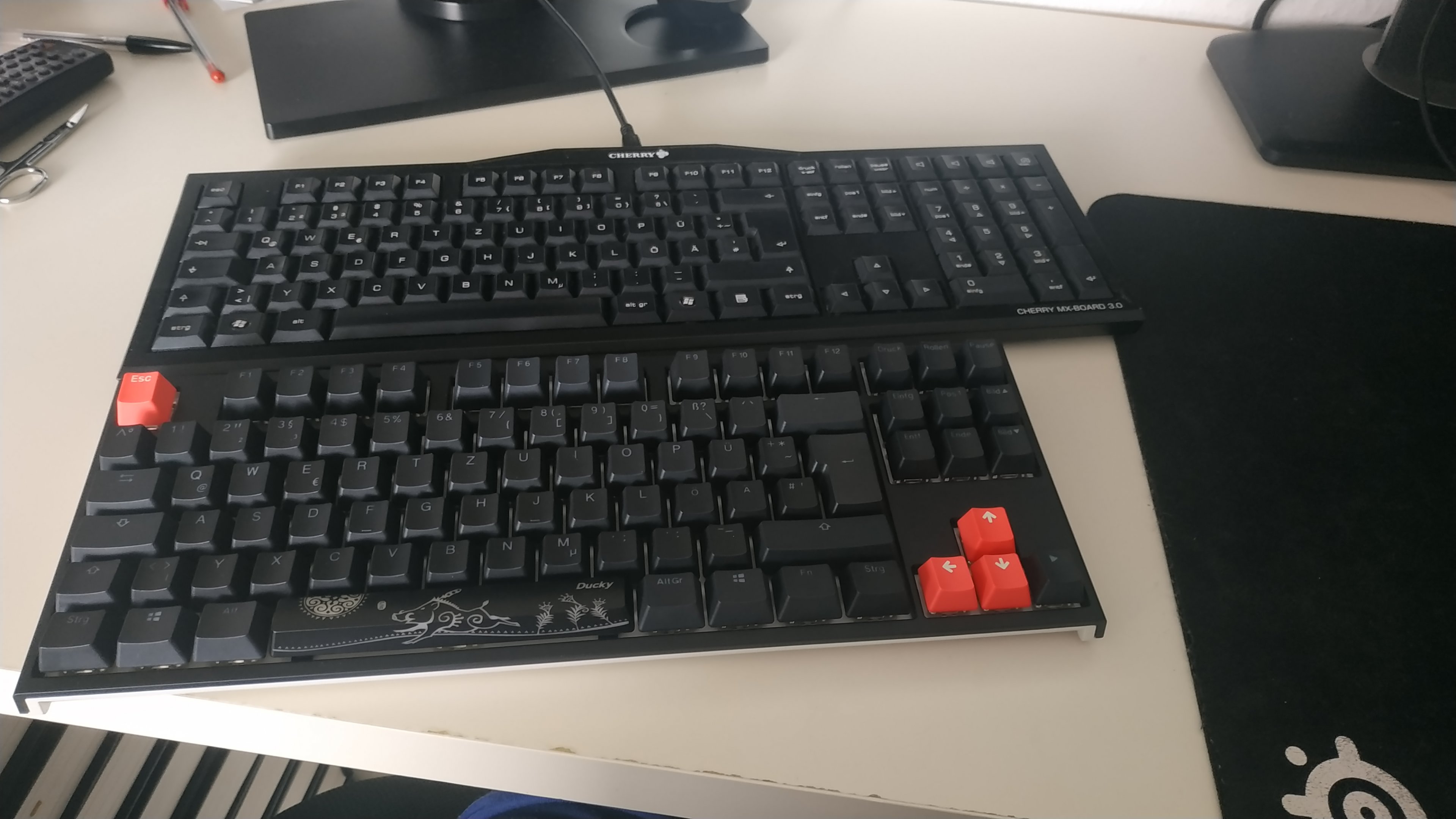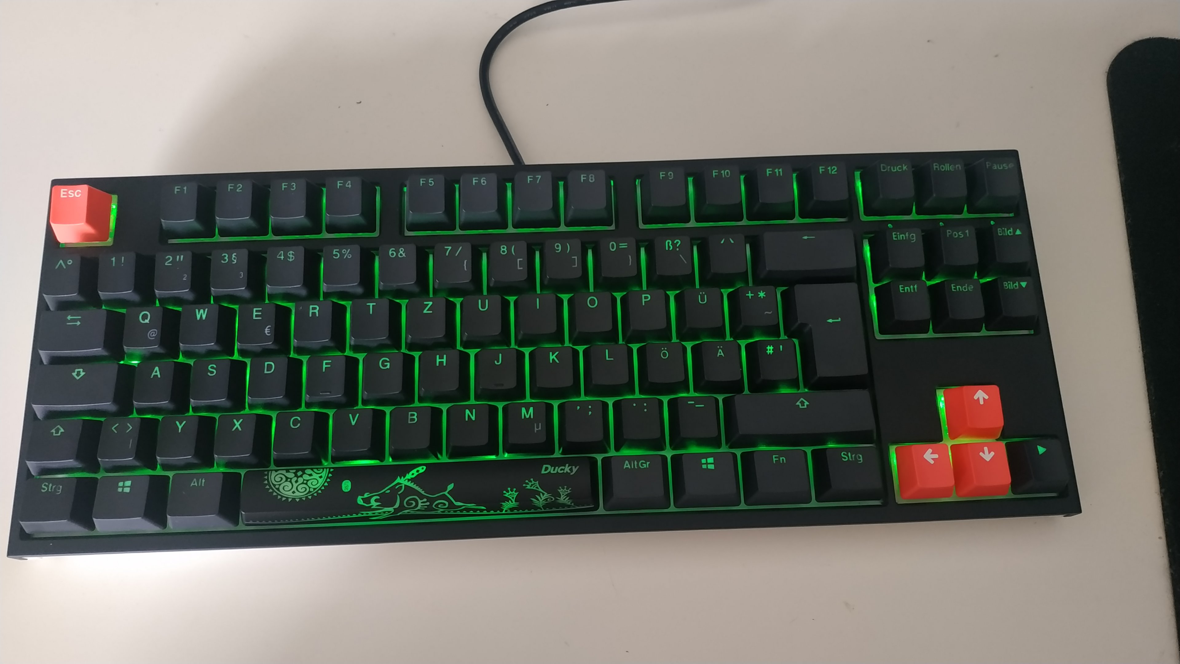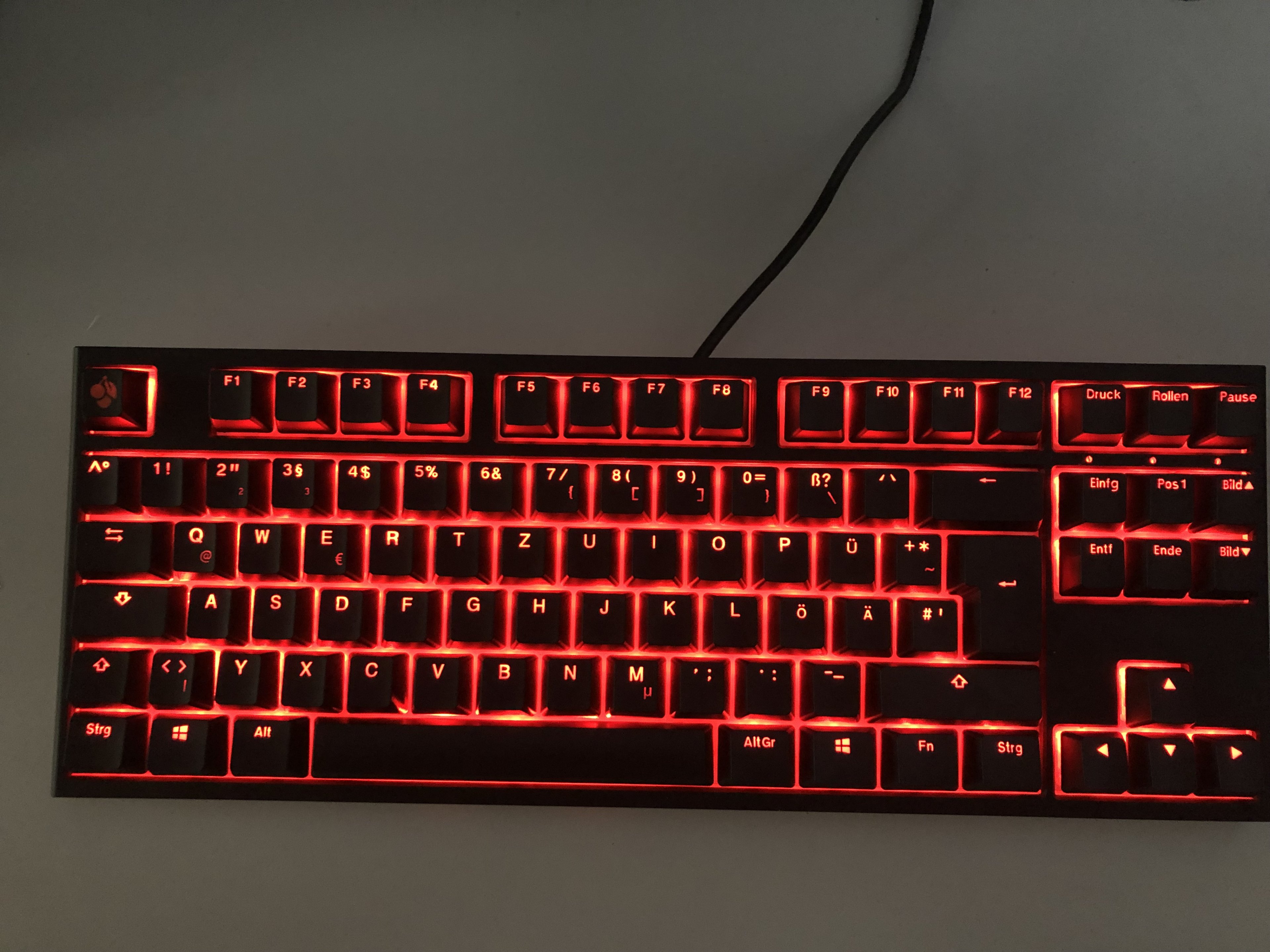 2. Die mitgelieferten roten Keycaps sind zwar vollständig in Quantität, aber leider habe ich zweimal Pfeiltaste nach oben erhalten und keine Pfeiltaste rechts... Ich denke aber, dass man das mit einer E-Mail an Ducky oder Caseking irgendwie regeln kann. Soll hier also nicht vordergründig Thema werden, wobei das bei dem Preis auch enttäuschend ist.