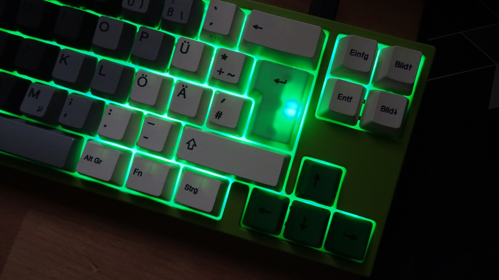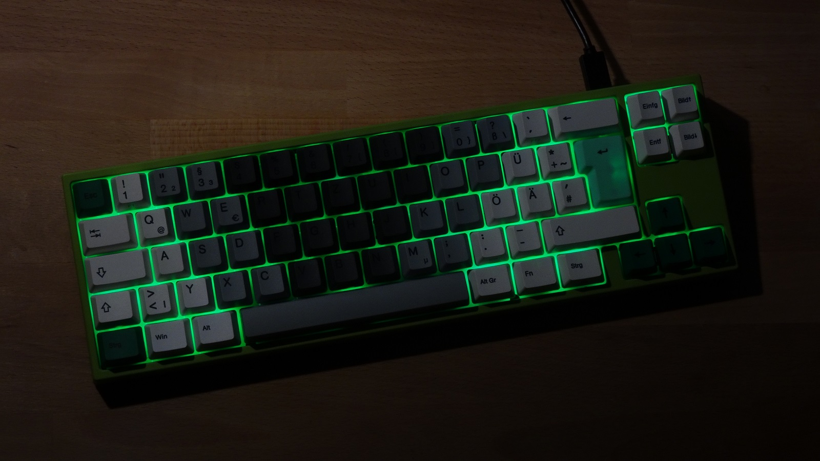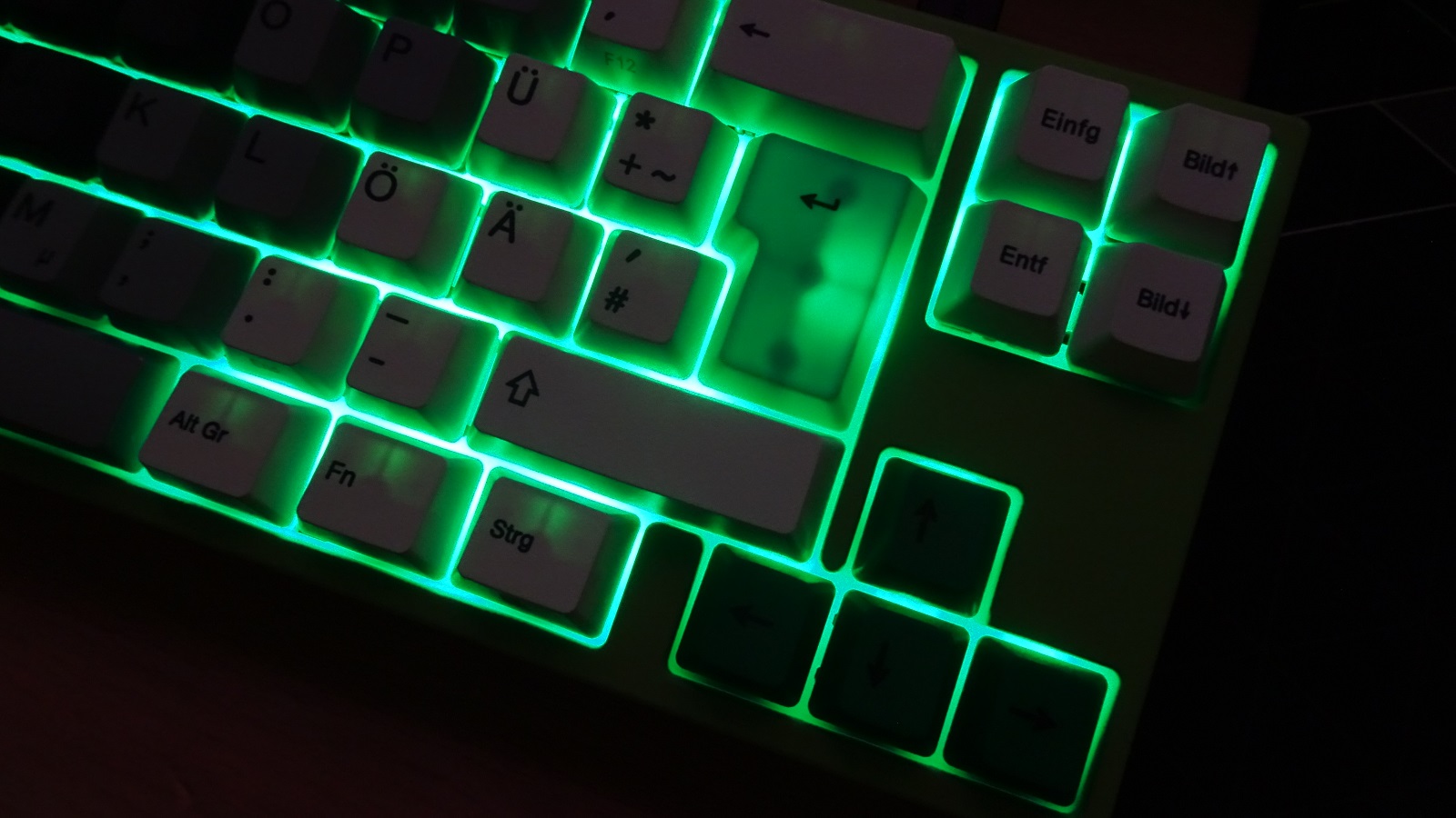 Ich habe mir unter jede Taste eine grüne LED bestellt, bis jetzt leuchtet nur Capslock, mit der Software beschäftige ich mich heute Abend oder Morgen. Die Caps sind schön flach, aber lichtundurchlässig, die weiße Plate war daher vermutlich keine schlechte Idee.
