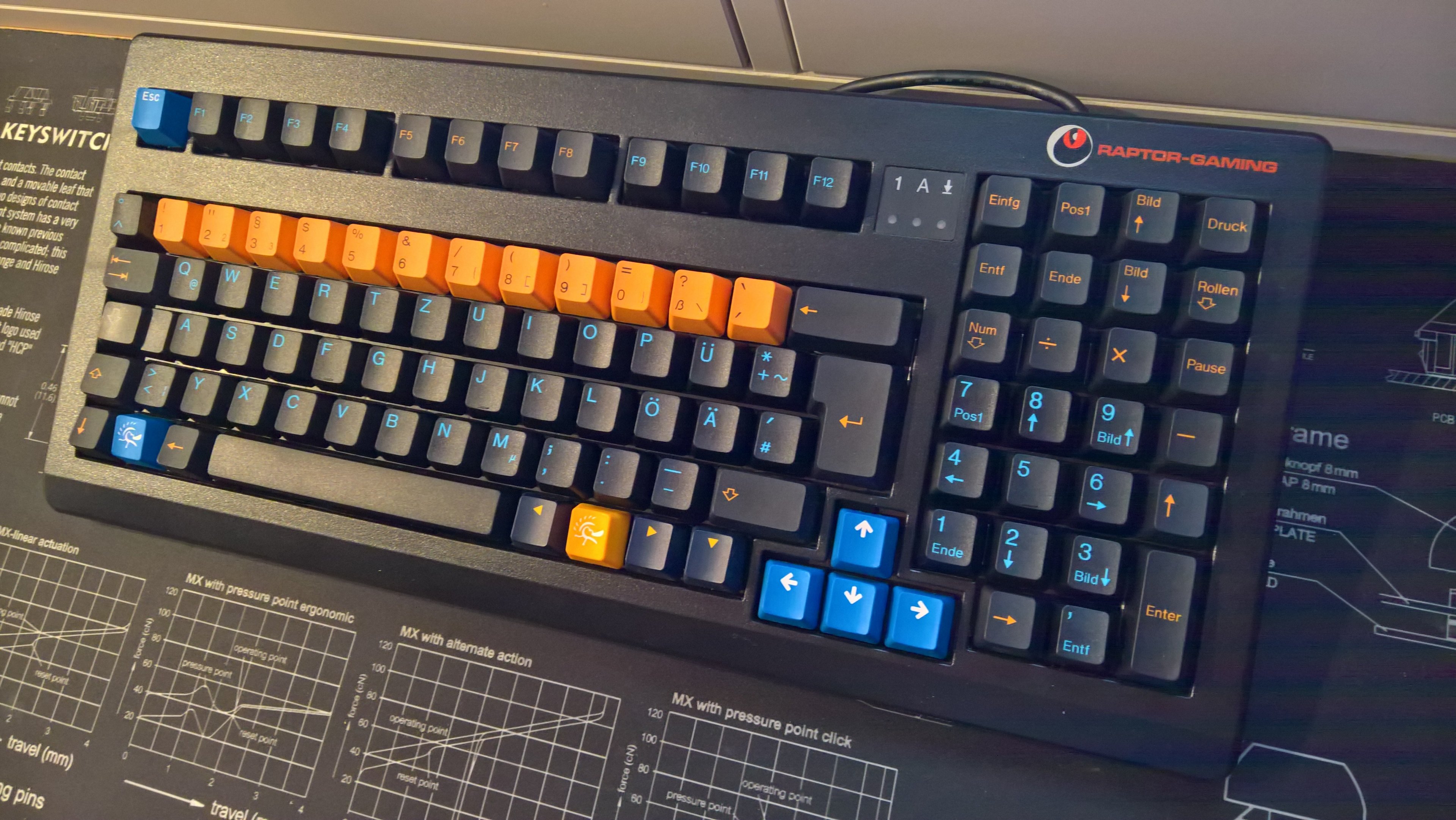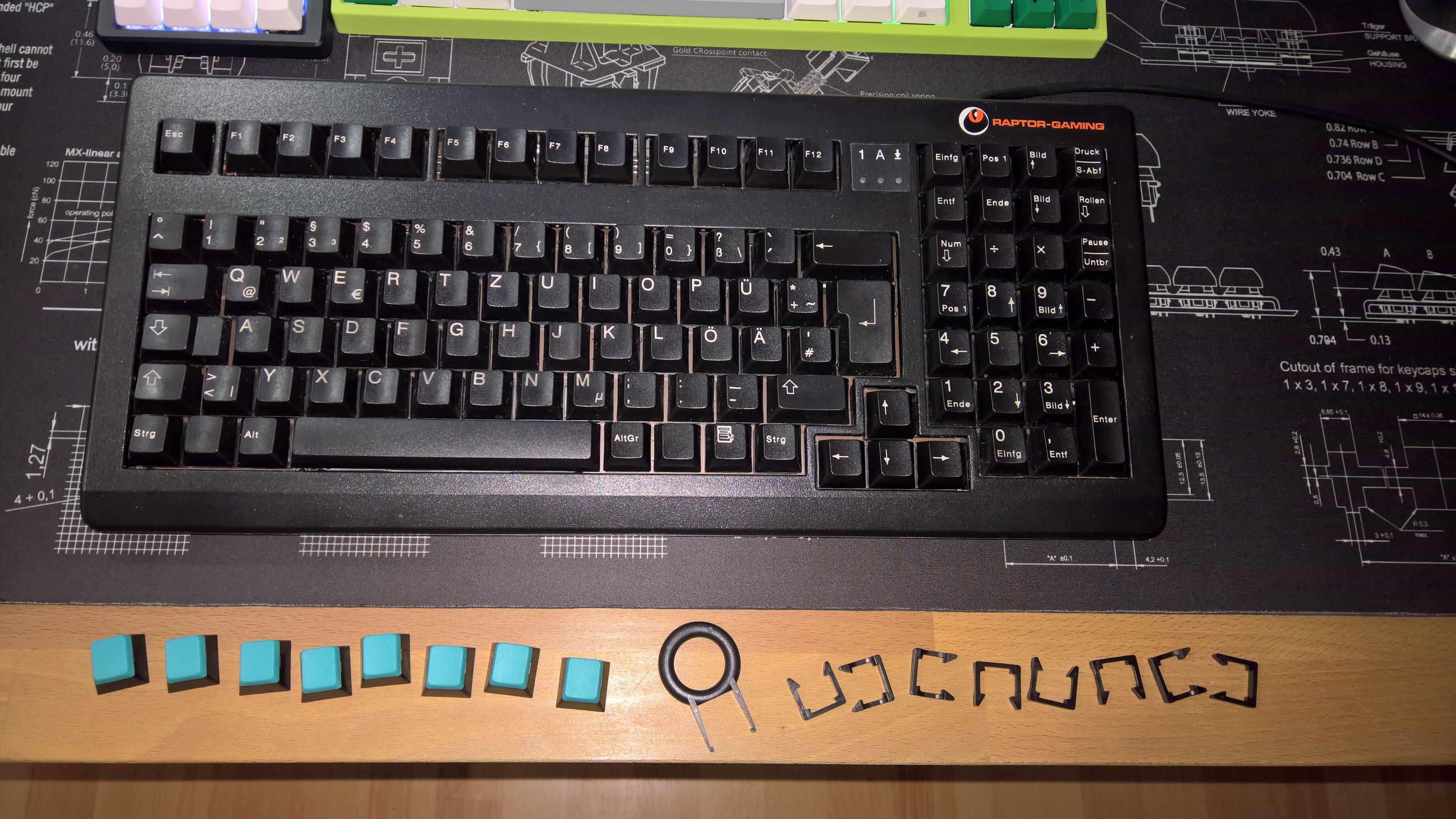 Eigentlich wollte ich die originalen Keycaps weiterverwenden, gerade wegen 1u bei [Strg], [Alt] und [Win], aber die Bildschreibehilfe empfinde ich als absolut grauenhaft. Ich wüsste gern, was Raptor dazu gebracht hat, die Fühlbalken wegzulassen und stattdessen "F" und "J" dermaßen zu wölben, was zu "Hängenbleibern" führt. Ich denke, das sollte beim Plan, sich eine K1 oder G80-1800 zuzulegen, bedenken: