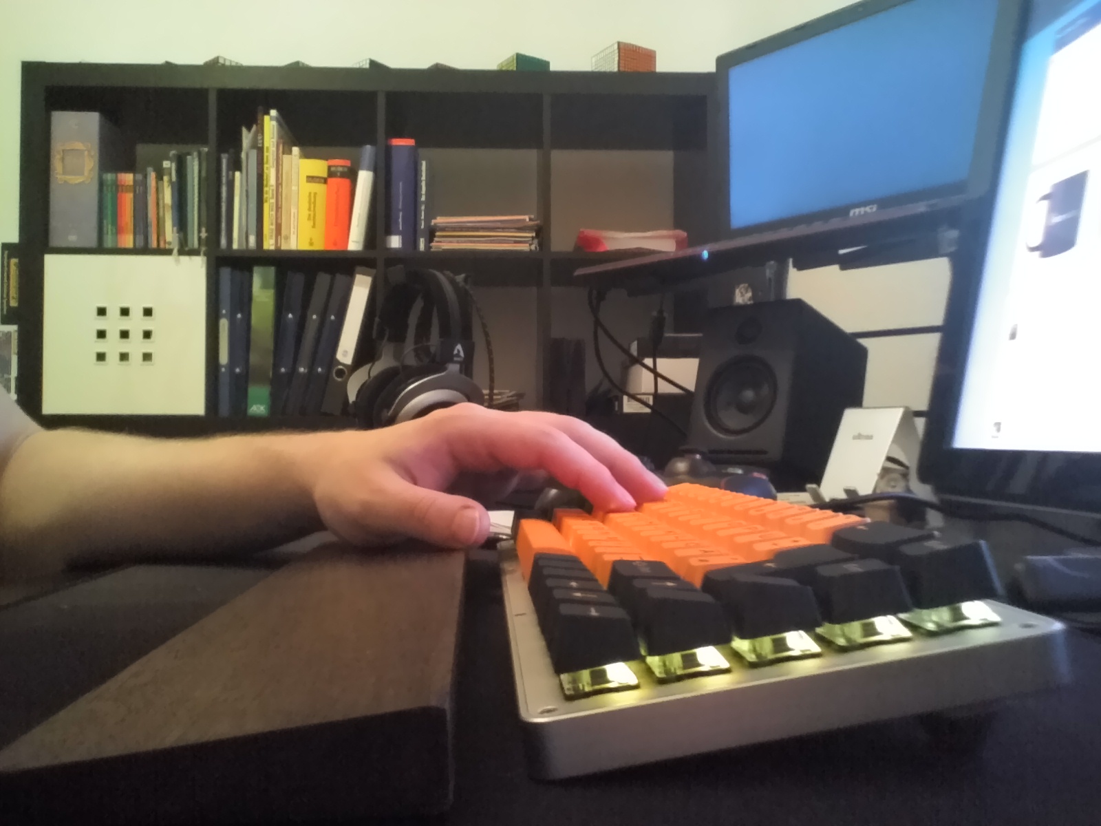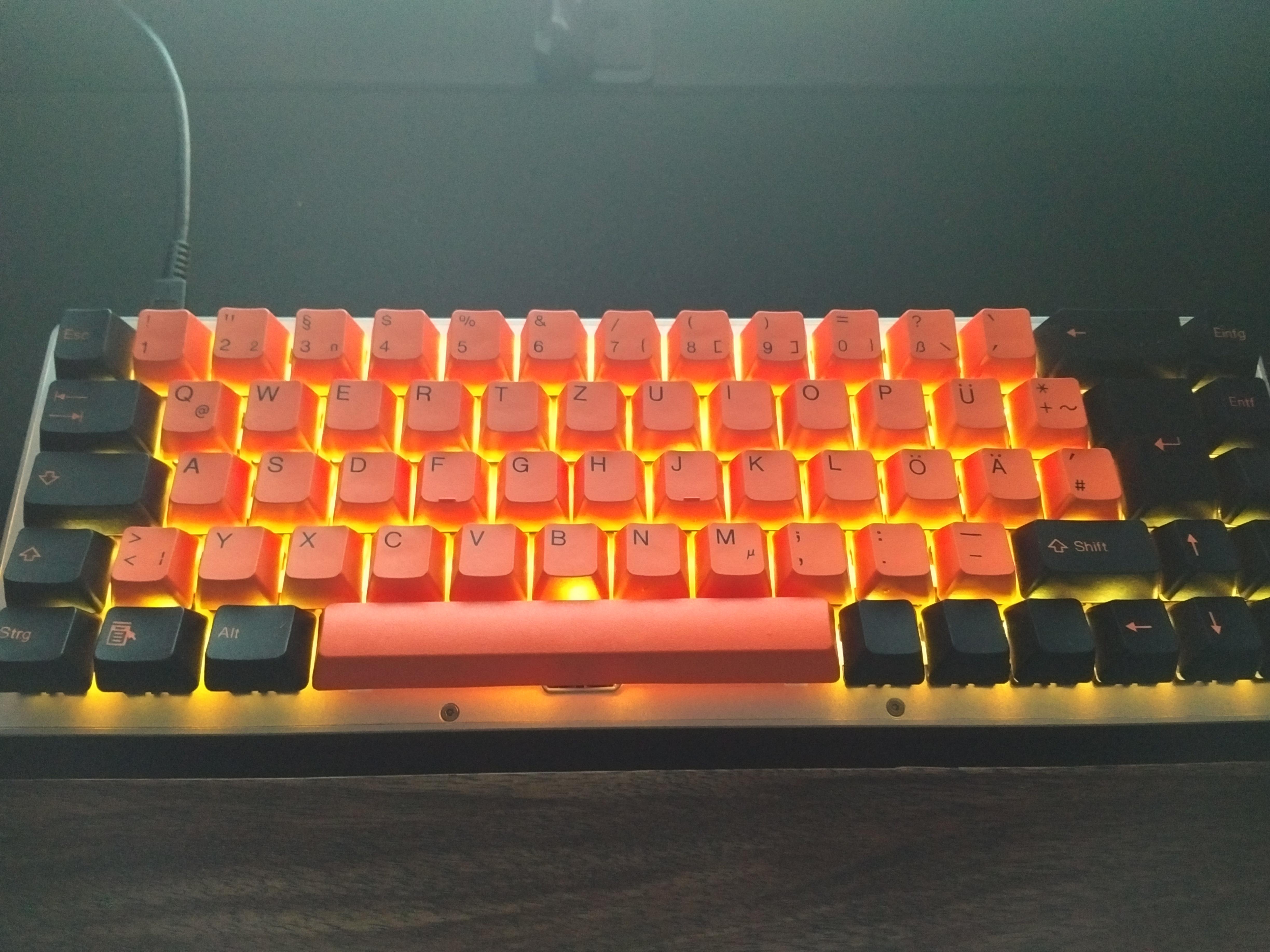 Der Stand ist immer noch Top. Tippe gerade darauf. Caps sind aktuell orange/schwarze TaiHao Caps drauf. Würde ich je nach Preis auch dabei lassen. Sonst sind noch die Standard-WhiteFox-Caps dabei. In meiner Signatur habe ich die WF ja etwas nähre beschrieben. Die Farbe der LEDs ändert sich je nach Cap-Farbe. Bei grauen oder weißen Caps wirkt die Farbe golden. Bei orangenen eher orange usw usf. Hier nochmal akutelle Fotos: