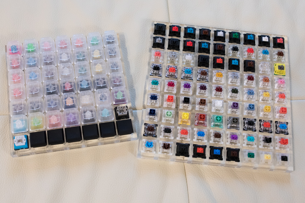 Gateron Milky Yellow, Everglide Tourmaline Blue, Everglide Orange, Kailh Clione Limacina (linear), Kailh Burgundy, Kailh Box Red, Kailh Box Dark Yellow, Gateron Milk Black.