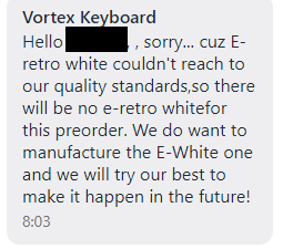 Jede Tastatur die "für den Kunden unzumutbar ist" muss in den Endpreis inkludiert werden, denn am Ende ist so eine Retoure im besten Fall B-Ware die man weiterverkaufen kann (Vortex B-Ware, wer kauft sowas nicht gerne).Trimipramin schrieb:Wenn da Kratzer sind, nehme ich das als Hersteller zurück und schaue, dass Kunde nen kratzerfreies Board bekommt