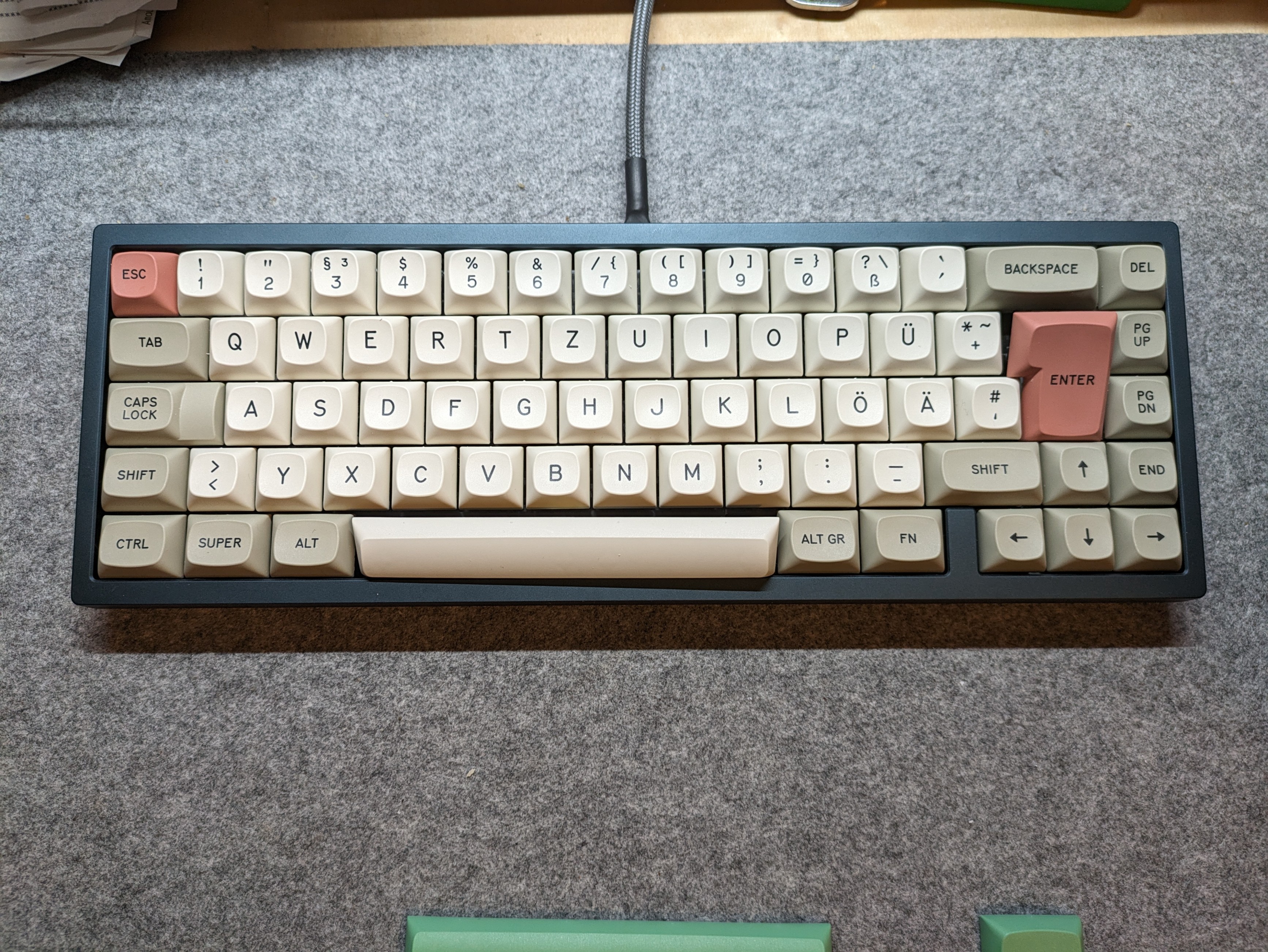 @Toadward Das beige Set sieht wirklich gut aus. Würde es ohne Orange und mit grauer Spacebar, aber den grün/roten Akzenten verwenden auf dem blauen Board (oder ganz ohne Akzente). @robertsonson Doof sieht das primär bei den großen Tasten aus, mit den Injektionspunkten, weil die halt wie so Nasen rausgucken. Die 1U sind unauffällig. Denke, ich geh da mal mit dem Skalpel ran. Sind ja alles keine weltbewegenden Probleme... Hoffe, deins kommt auch bald!