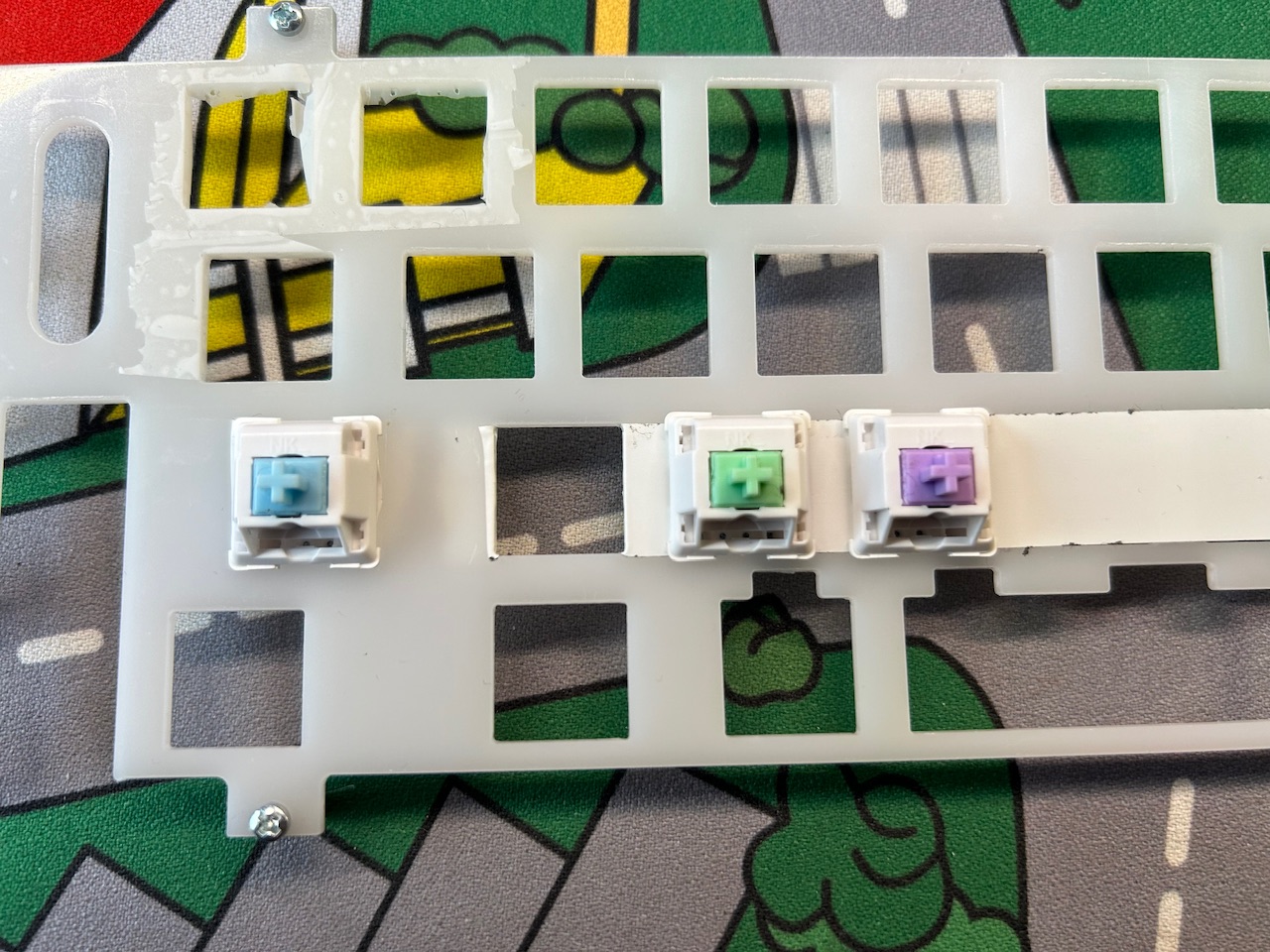 Ich hab die Milk Truck heute mal auf die DCX Emerlad vorbereitet. Plate Foam raus, Isoband in die Ausschnitte der Plate und jetzt halten die Switches deutlich besser. Nachdem das PCB Millmax bekommen hat, sind mir da öfters mal Switches raus gehüpft.