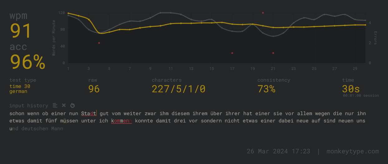 Schläfst Du da vor der Tastatur nicht ein?SeppoE schrieb:Inzwischen hab ich damit fast wieder 20WPM geknackt.