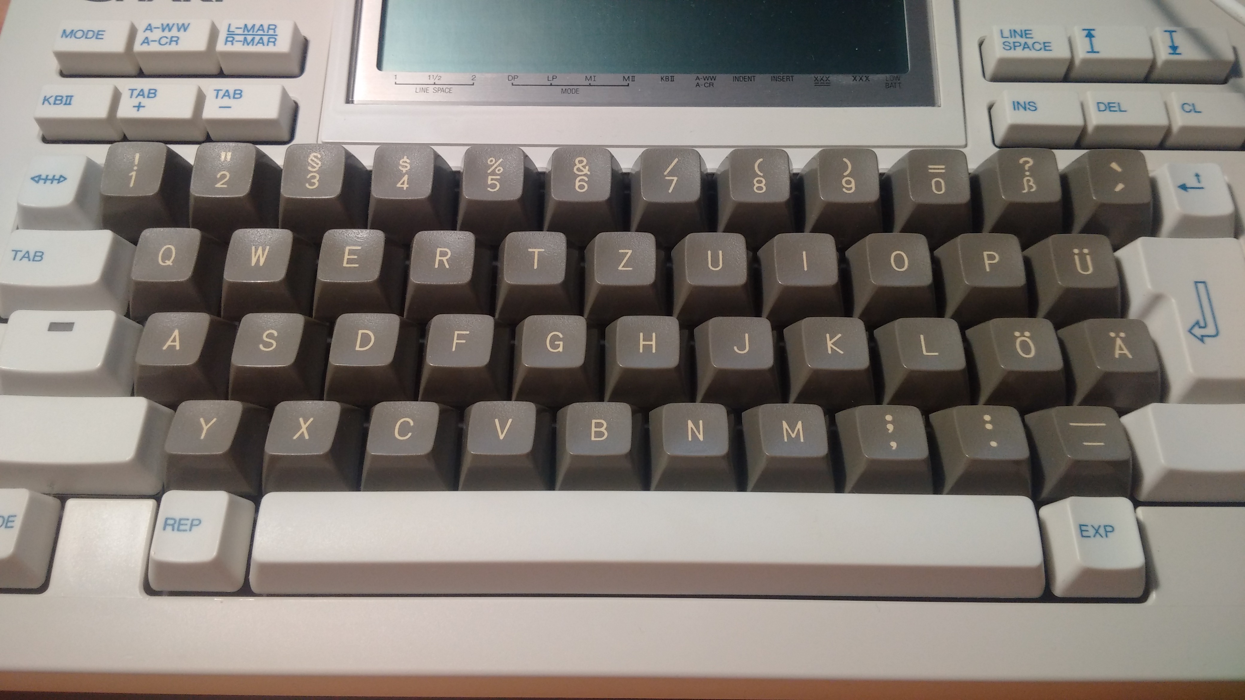 Abgesehen davon bin ich mir noch gar nicht sicher, ob ich es nicht doch vielleicht behalten möchte. Die Beschriftung ist leider etwas vergilbt, vermutlich hat der Besitzer die Abdeckhaube nicht benutzt, die Menge an Staub in der Maschine lässt ähnliches vermuten. Aber die Textur der Tastenkappen ist wie neu :3. Hätte die Schreibmaschine jetzt noch nicht Alps integrated Domes, sondern richtige Alps-Switches, wäre ich richtig richtig happy