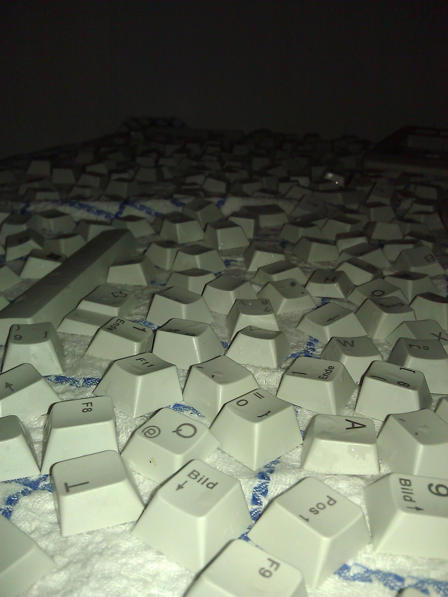 Edit: Apropos trocknen, das kann man mit einem Fön beschleunigen oder die Tasten erstmal in einem Sieb abtropfen lassen und dann in einem Handtuch eingeschlagen auf die Heizung legen.