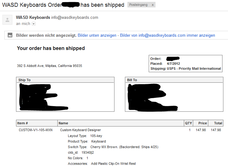 Ich habe WASD gebeten keine Rechnung beizulegen.. sondern diese per Email zu senden..