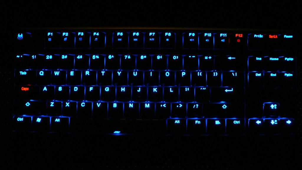 Das Board hat übrigens keine Anzeige-LEDs, sondern der Status von Caps, Scroll Lock und deaktivierte WIN-Taste wird in einer zweiten Farbe dargestellt. Ich habe ja die blaue Version mit MX-Reds bestellt, die drei genannten Tasten sind rot beleuchtet. Das Board gibt es auch noch in drei anderen Beleuchtungs-Varianten und mit diversen Switches.