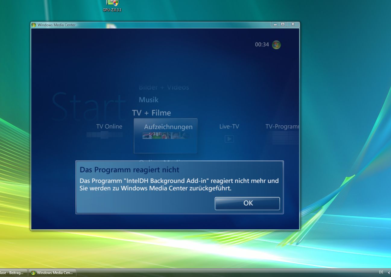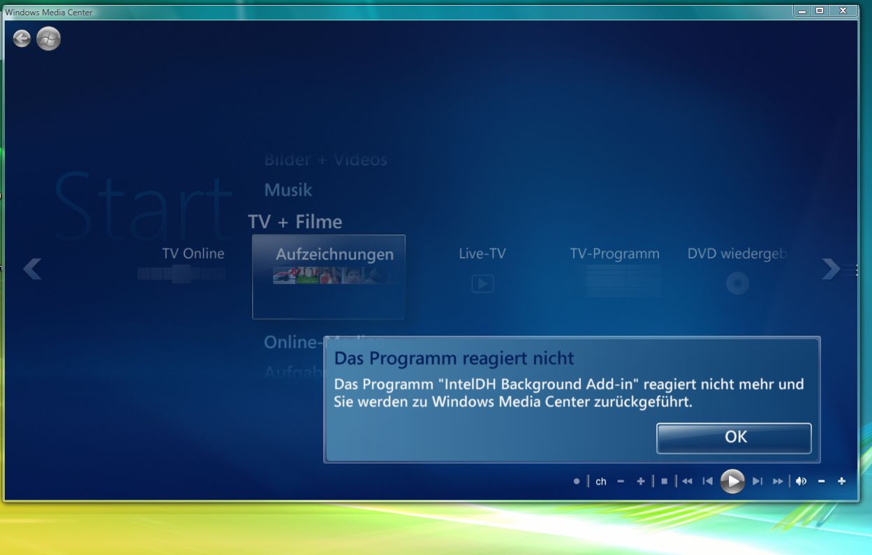 Wenn ich nun Windows Media Center starte passiert für 1-2 (oder auch 3) sec. lang alles normal. Dann kommt so eine Meldung (siehe angehängtes Bild). Wenn ich dort nun auf "ok" klicke kann ich Windows Media Center wieder ganz normal benutzen. Nichts klemmt, usw. ...