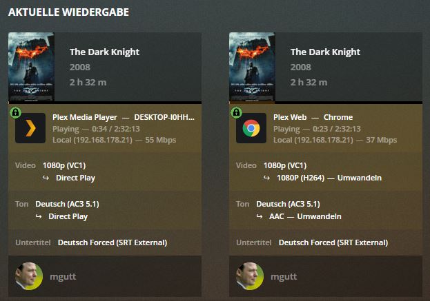 Nutze das Plex Dashboard um immer direkt zu sehen was auf den Clients los ist. Hier zB auf dem selben PC Plex im Browser und mit dem Client: