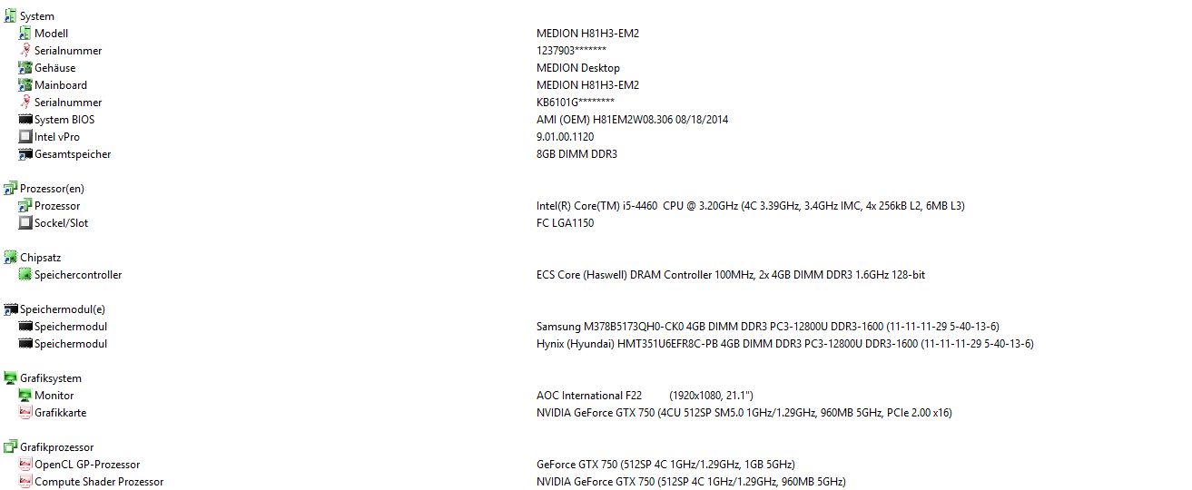 Nun habe ich einen weiteren RAM Speicher mit 4 GB gekauft, mit genau den gleichen Werten Hynix 4GB PC3-12800 DDR3- 1600MHz non-ECC Unbuffered CL11 240-Pin DIMM , Verbaut von Medion ist ein Samsung.