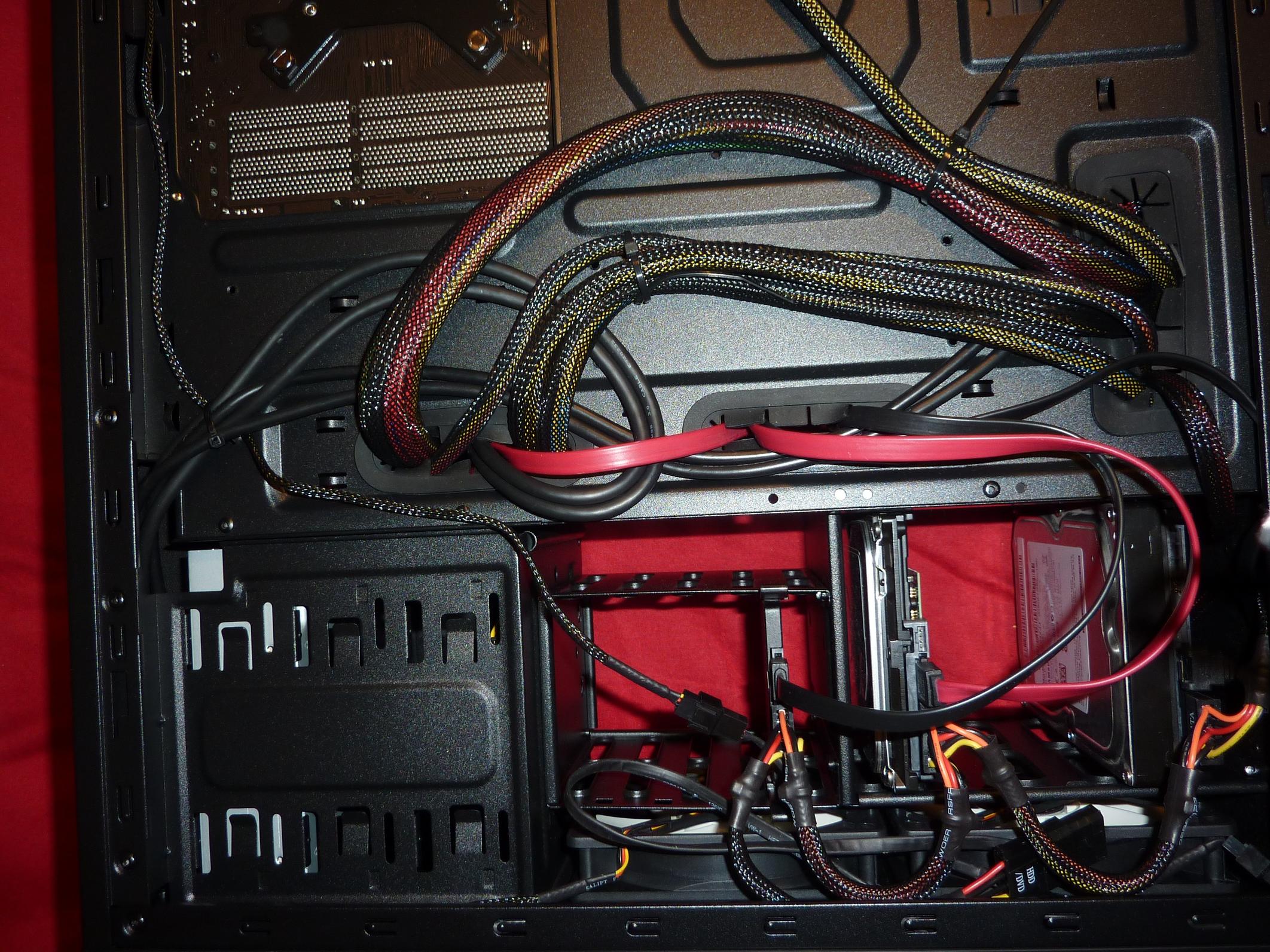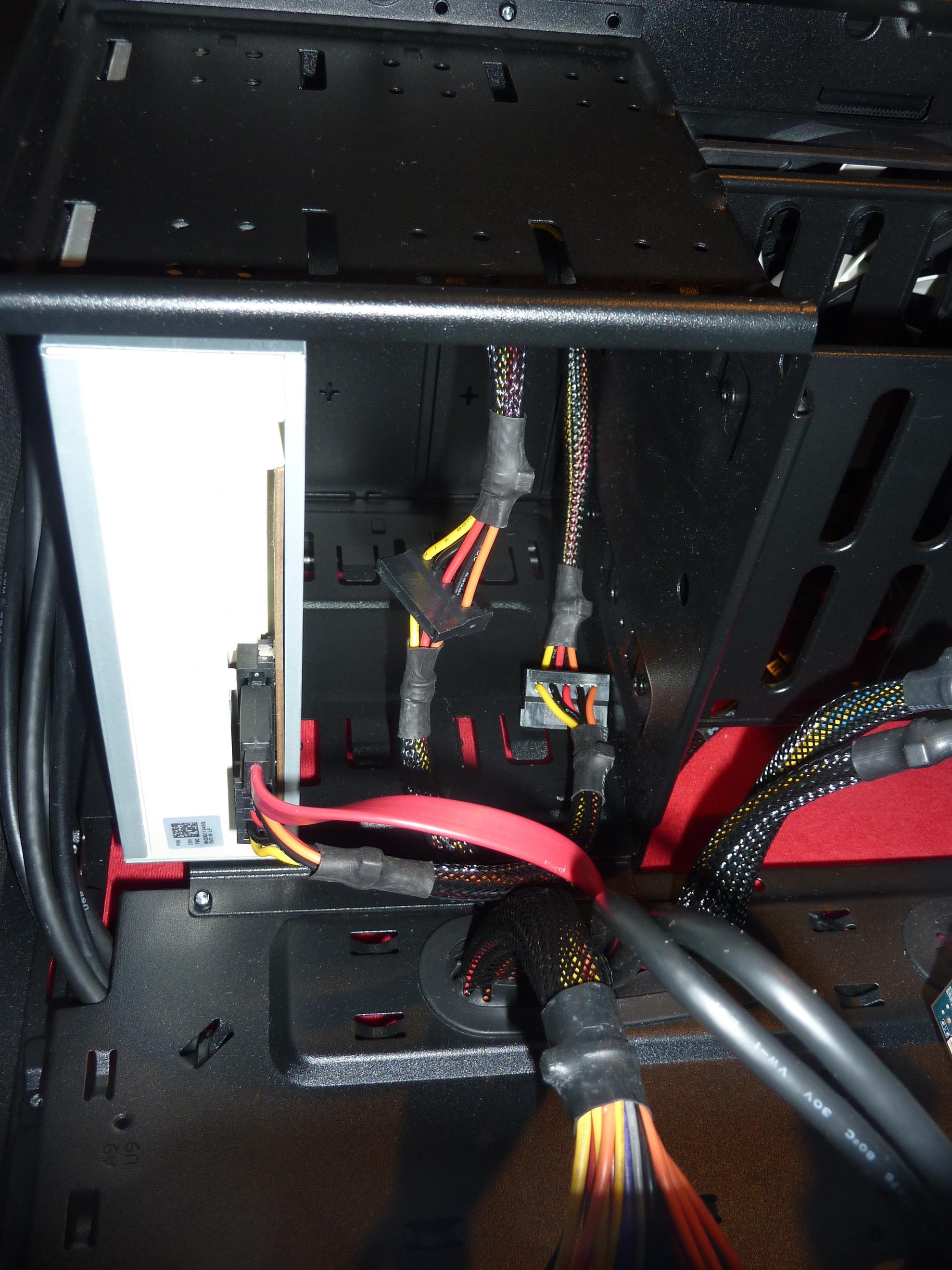 Die Laufwerke, werden von verschiedenen Seiten eingesteckt, aber von rechts ("versteckte Seite") angeschlossen, da ist wirklich wenig Platz bis zur Rückwand, und ich musste 2 Kabelstränge meines modularen Netzteils verwenden, weil man vom 5,25" Laufwerk schlecht zu den anderen kommt.