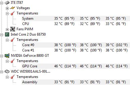 Bei 27 bis 28°C Raumtemp hier idlet die CPU auf 38° vor sich hin, die Graka hat aktuell etwa 50°, das Board bietet 42 und die Platte 34.