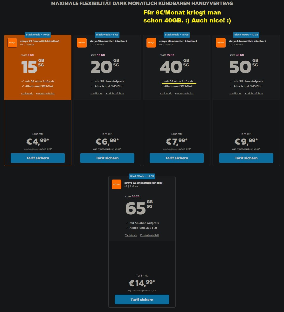 Alles inkl. 5G und monatlich kündbar. Für alle was da. Einfach mal die Suchen checken, bei myDealz, oder Check24.