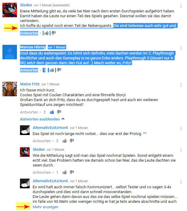 Man sieht bspw. hier beim markierten Text, dass darunter noch eine ausgeblendete Zeile versteckt ist. Außerdem ist bei einem Kommentar weiter unten der "Mehr anzeigen"-Link vorhanden: