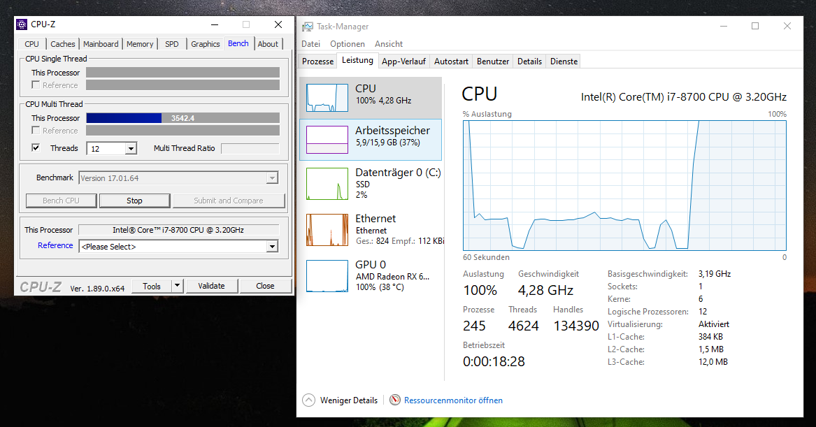 Die PCIe-Anbindung ist korrekt. Das können wir ausschließen. Bei dem Screenshot im Taskmanager sind CPU und GPU auf 100%. Lief da gerade PoE oder was schafft CPU und GPU gleichzeitg auf 100% zu bringen?