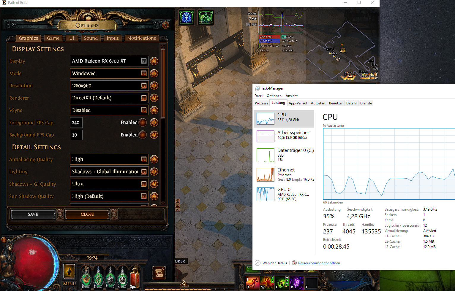 Das hilft. Also falls das der Normalzustand während PoE ist, dann ist nicht die CPU der limitierende Faktor, erkennbar, dass die GPU bereits bei 99% ist.