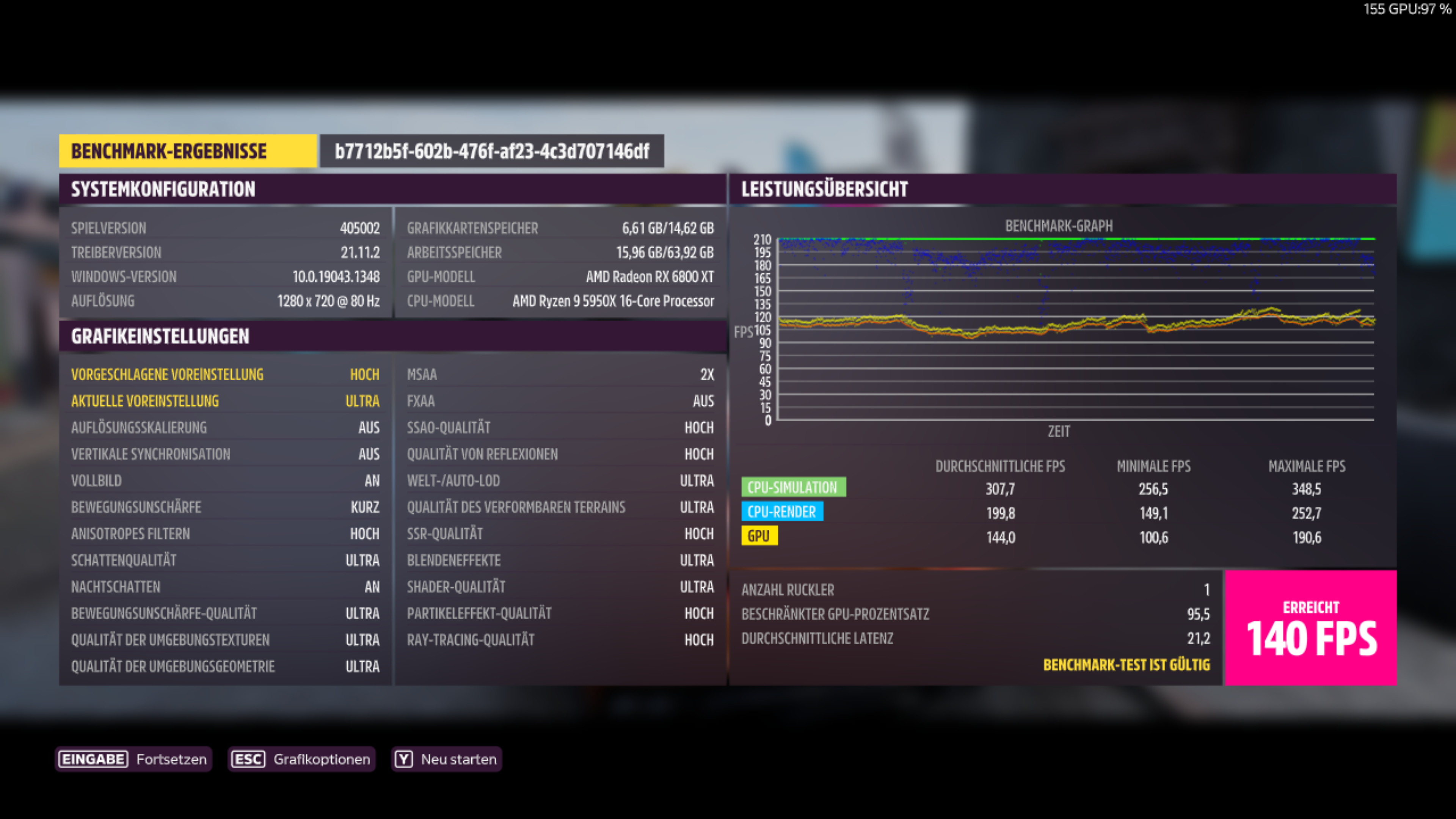 1.280 x 720, Preset Ultra (für Nerds!): 140