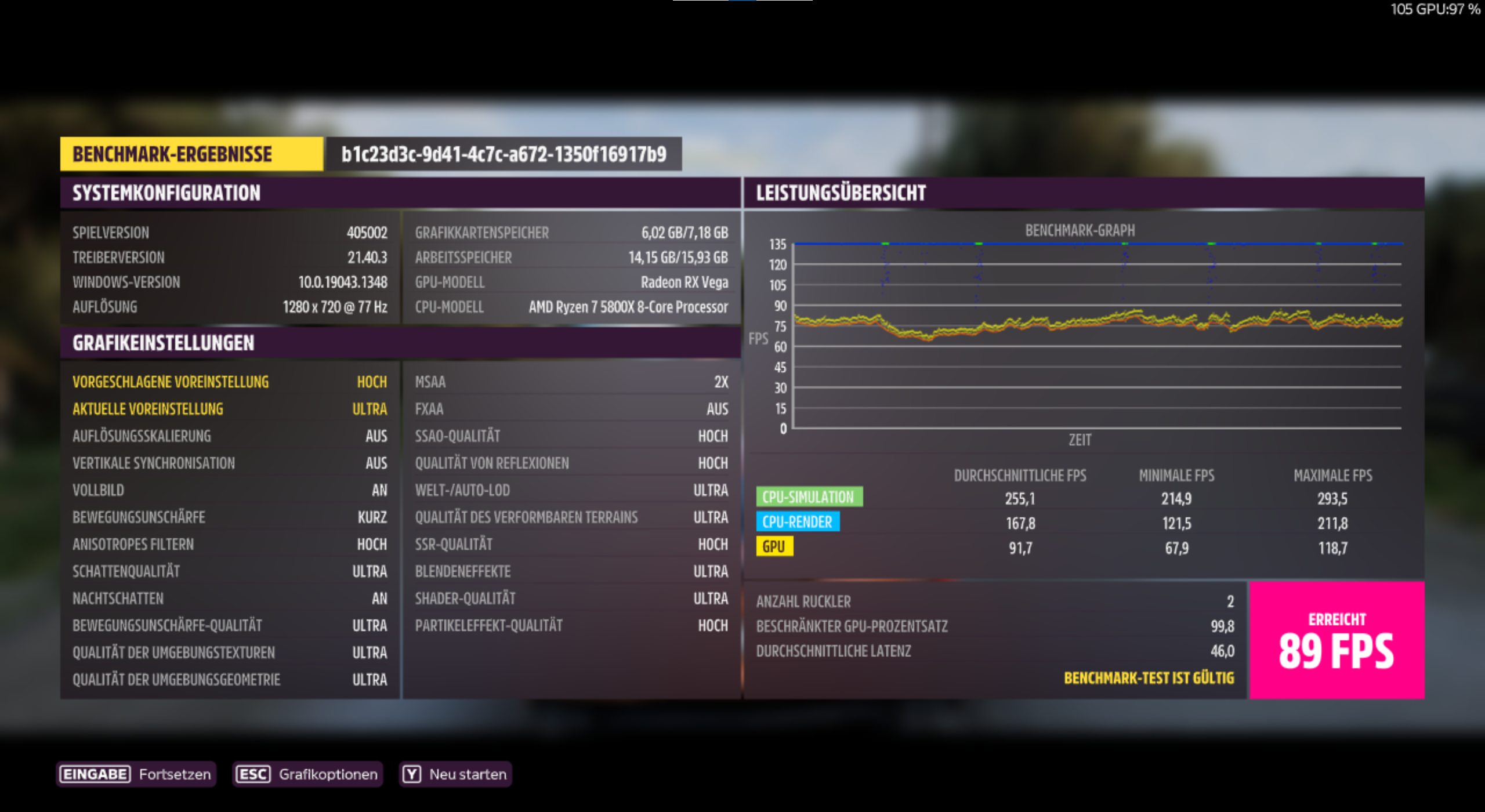 1.280 x 720, Preset Ultra (für Nerds!): 89