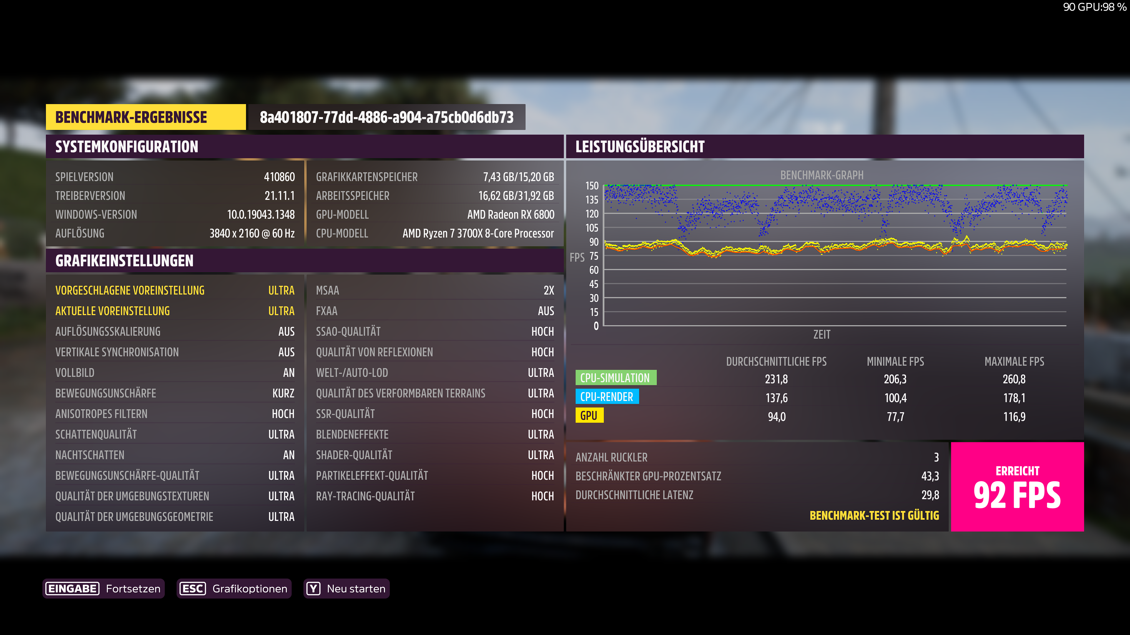 edit: habe die Werte jetzt angepasst. Bewegungsunschärfe an und HDR aus. HDR hat in UHD auch 1 FPS gekostet, deswegen ausgeknippst. Test jetzt auch mit dem allerneusten AMD Treiber, der die Performance noch einmal verbessert da ist der Unterschied zum Beta nicht mehr groß. Forza liest diesen aber nicht korrekt aus, daher ein Screenshot des Treibers.